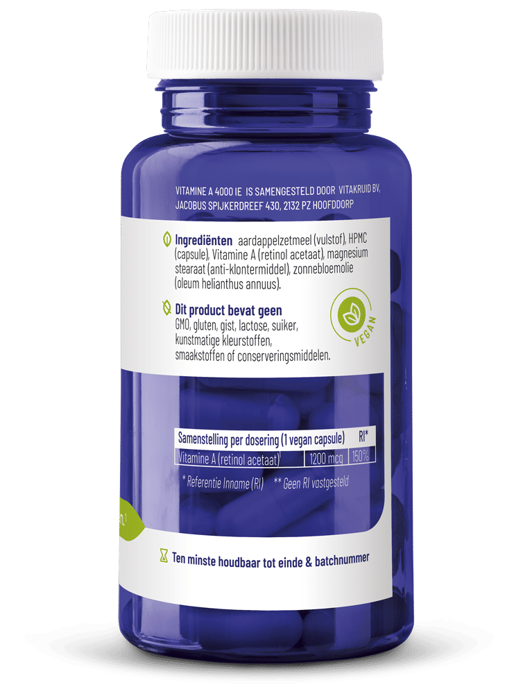 Aardappelzetmeel (vulstof), HPMC (capsule), Vitamine A (retinol acetaat), magnesium stearaat (anti-klontermiddel), zonnebloemolie (oleum helianthus annuus).