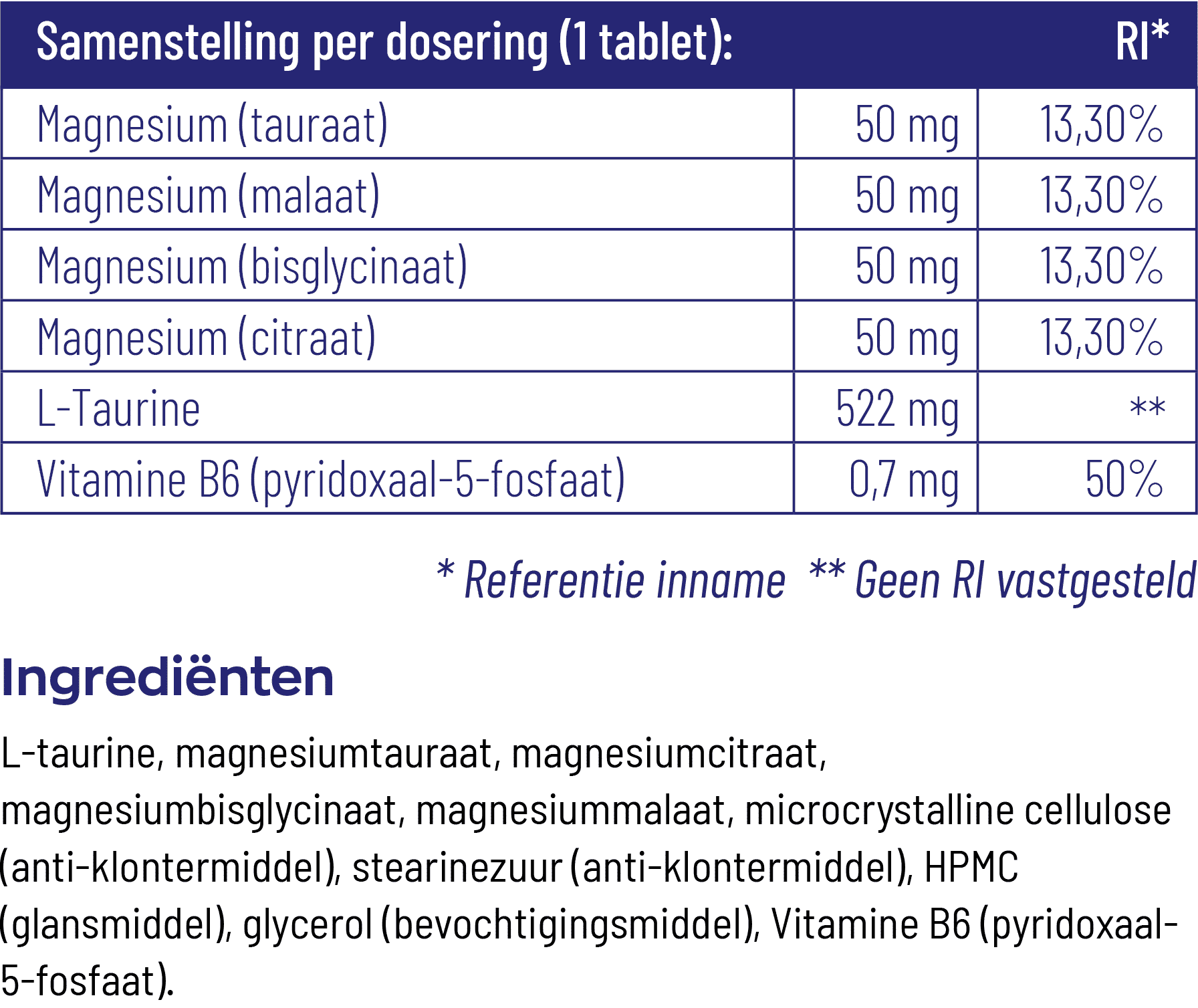 L-taurine, magnesiumtauraat, magnesiumcitraat, magnesiumbisglycinaat, magnesiummalaat, microcrystalline cellulose (anti-klontermiddel), stearinezuur (anti-klontermiddel), HPMC (glansmiddel), glycerol (bevochtigingsmiddel), Vitamine B6 (pyridoxaal-5-fosfaat).