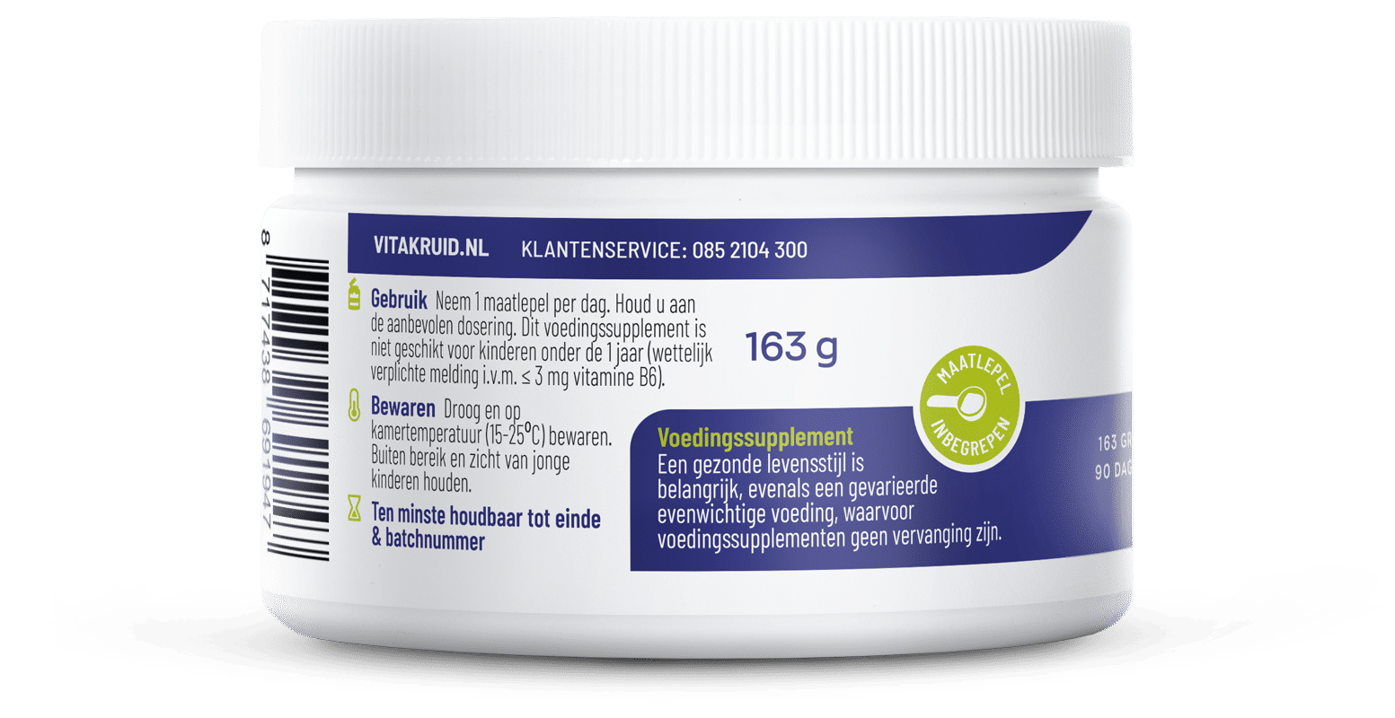 Een gevarieerde, evenwichtige voeding en een gezonde levensstijl zijn belangrijk. Een voedingssupplement is geen vervanging van een gevarieerde voeding.