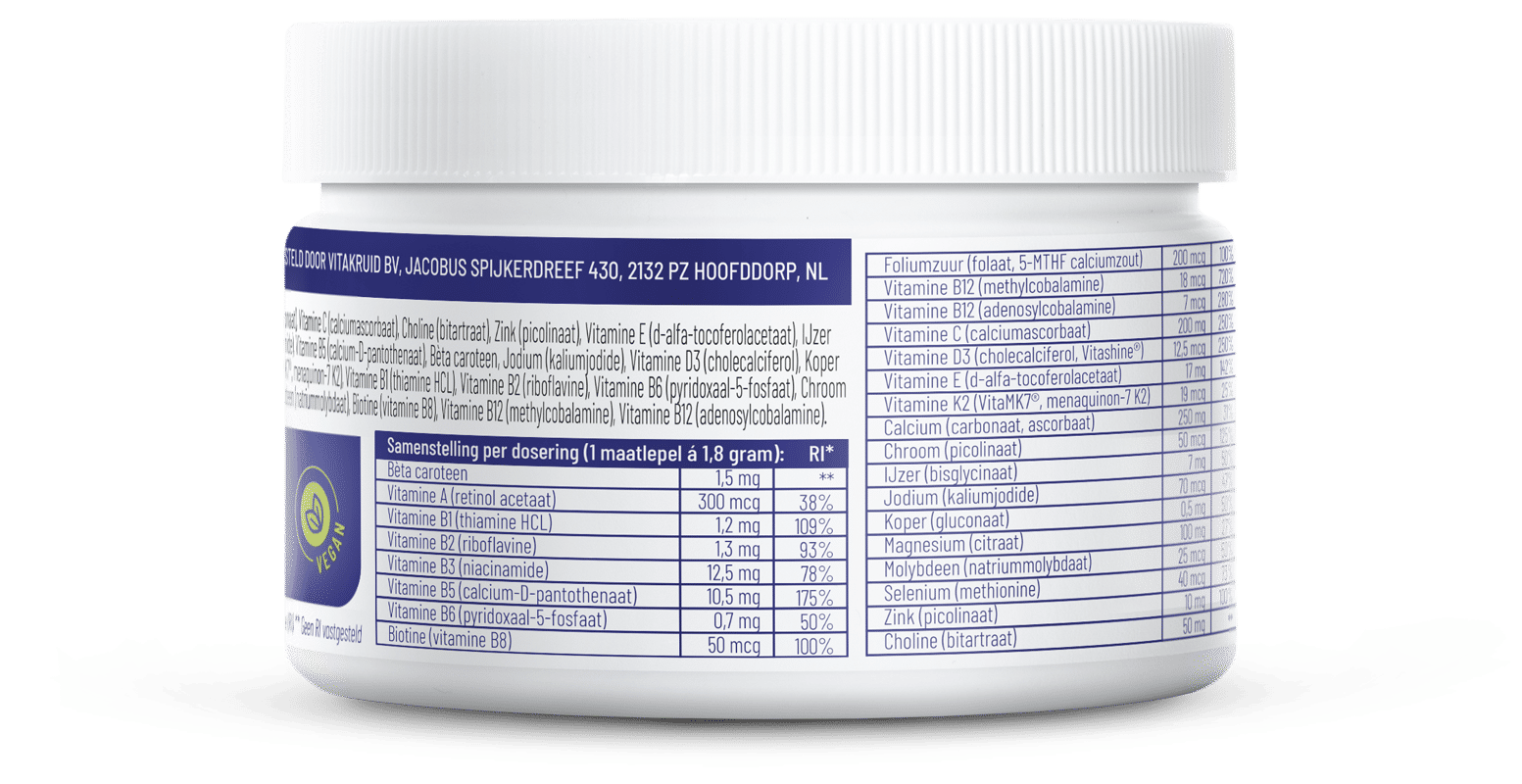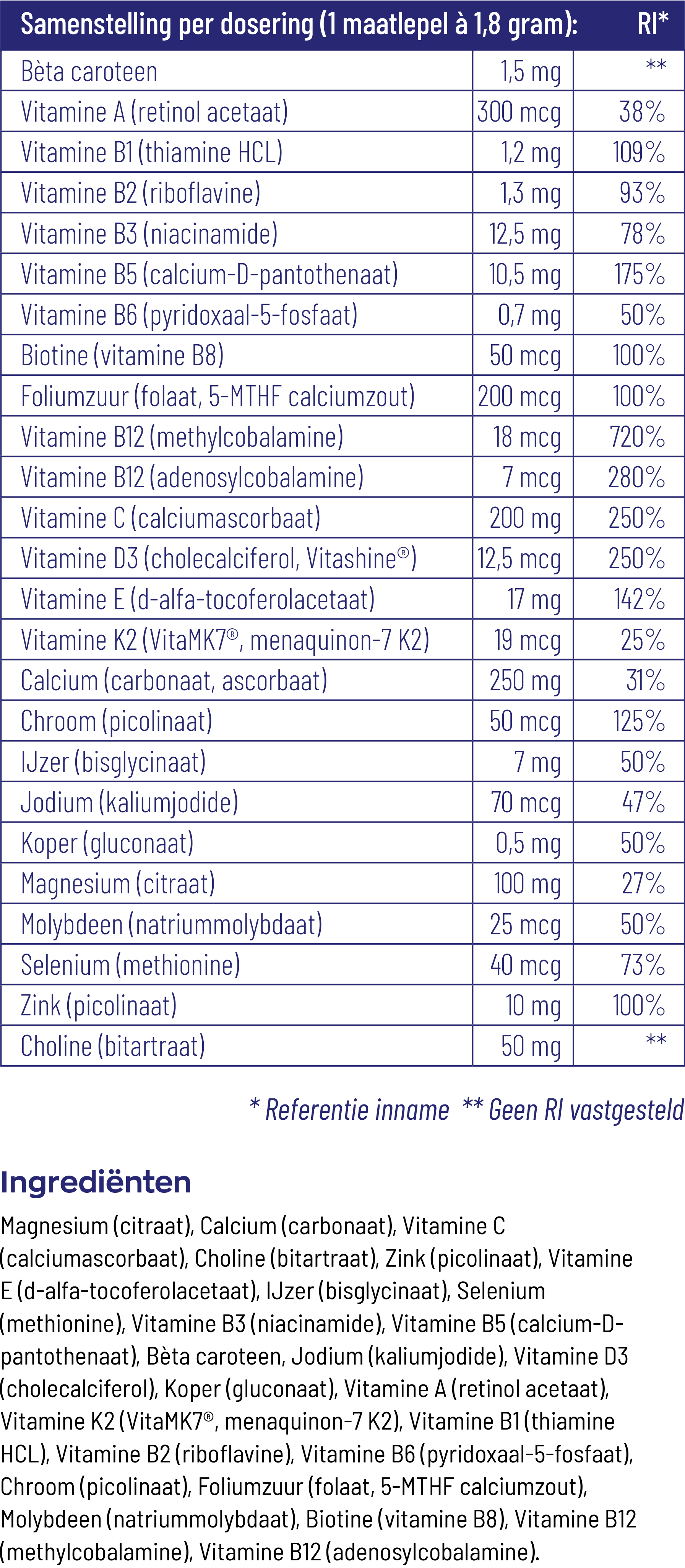 Magnesium (citraat), Calcium (carbonaat), Vitamine C (calciumascorbaat), Choline (bitartraat), Zink (picolinaat), Vitamine E (d-alfa-tocoferolacetaat), IJzer (bisglycinaat), Selenium (methionine), Vitamine B3 (niacinamide), Vitamine B5 (calcium-D-pantothenaat), Bèta caroteen, Jodium (kaliumjodide), Vitamine D3 (cholecalciferol), Koper (gluconaat), Vitamine A (retinol acetaat), Vitamine K2 (VitaMK7®, menaquinon-7 K2), Vitamine B1 (thiamine HCL), Vitamine B2 (riboflavine), Vitamine B6 (pyridoxaal-5-fosfaat), Chroom (picolinaat), Foliumzuur (folaat, 5-MTHF calciumzout), Molybdeen (natriummolybdaat), Biotine (vitamine B8), Vitamine B12 (methylcobalamine), Vitamine B12 (adenosylcobalamine)