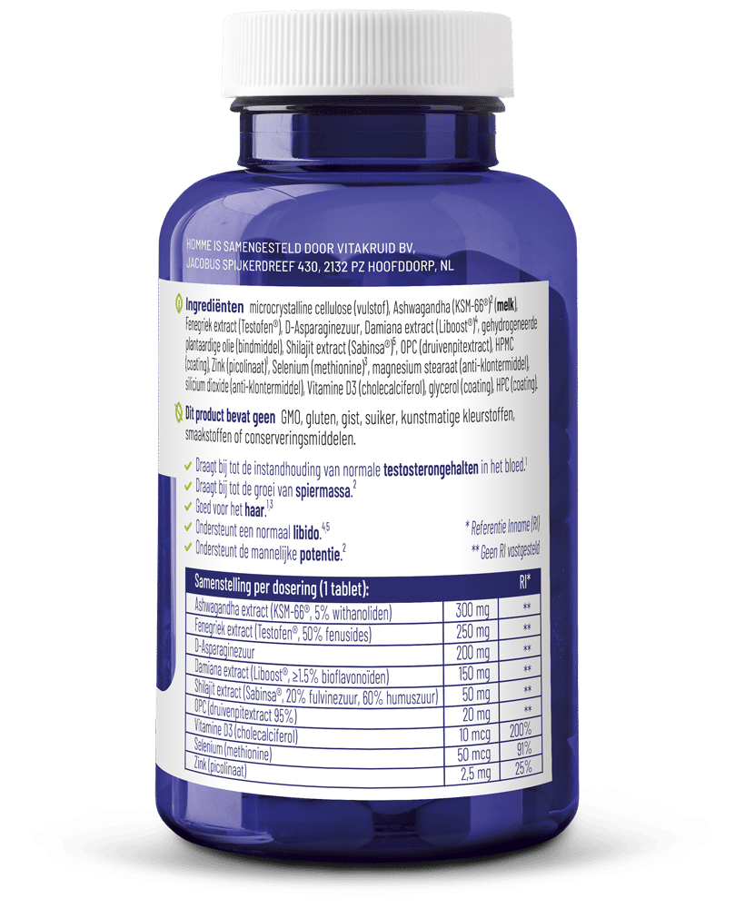 Microcrystalline cellulose (vulstof), Ashwagandha (KSM-66®) (MELK), Fenegriek extract (Testofen®), D-Asparaginezuur, Damiana extract (Liboost®), gehydrogeneerde plantaardige olie (bindmiddel), Shilajit extract (Sabinsa®), OPC (druivenpitextract), HPMC (coating), Zink (picolinaat), Selenium (methionine), magnesium stearaat (anti-klontermiddel), silicium dioxide (anti-klontermiddel), Vitamine D3 (cholecalciferol), glycerol (coating), HPC (coating).