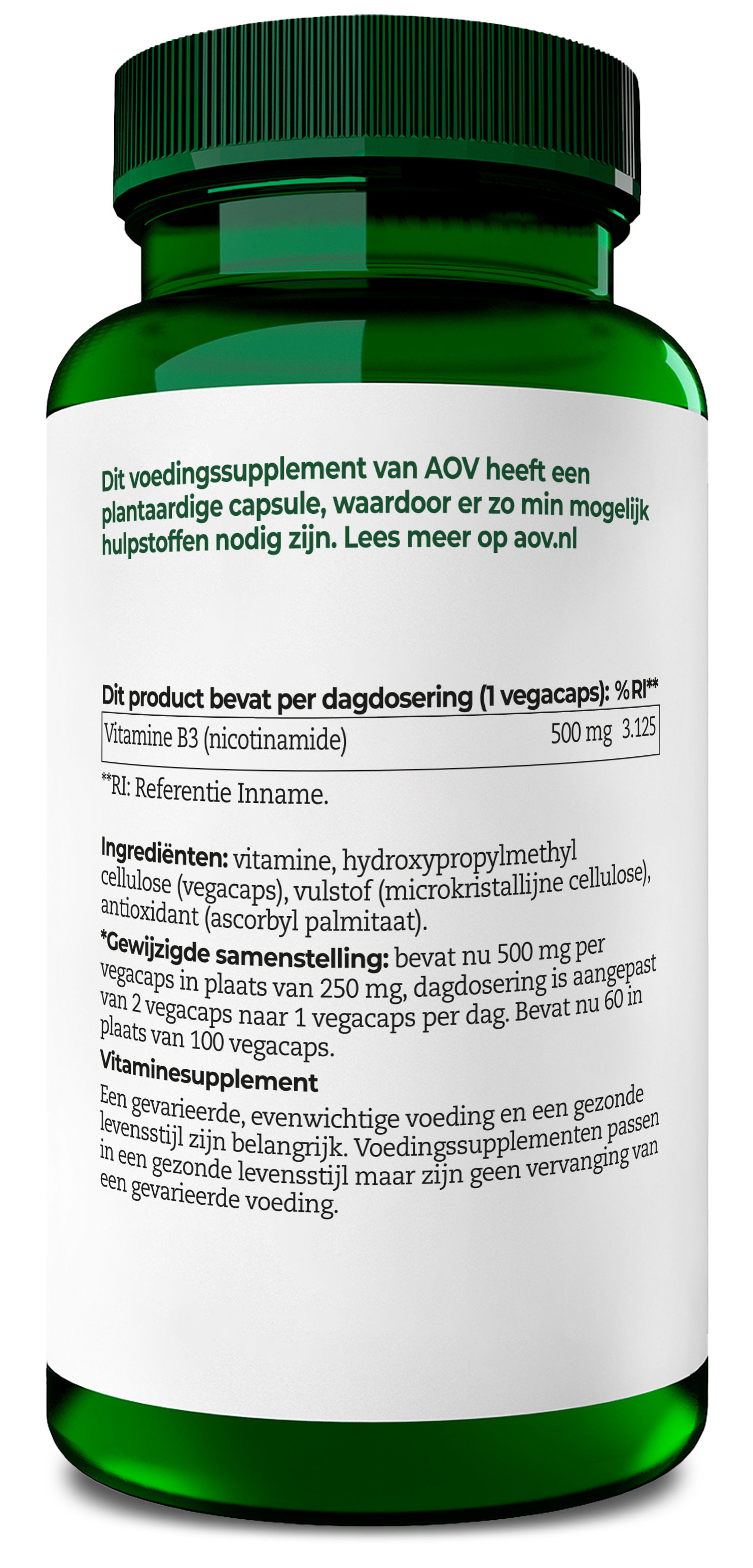 Vitamine B3 (nicotinamide), hydroxypropylmethylcellulose (vegacaps), vulstof (microkristallijne cellulose), antioxidant (ascorbyl palmitaat)