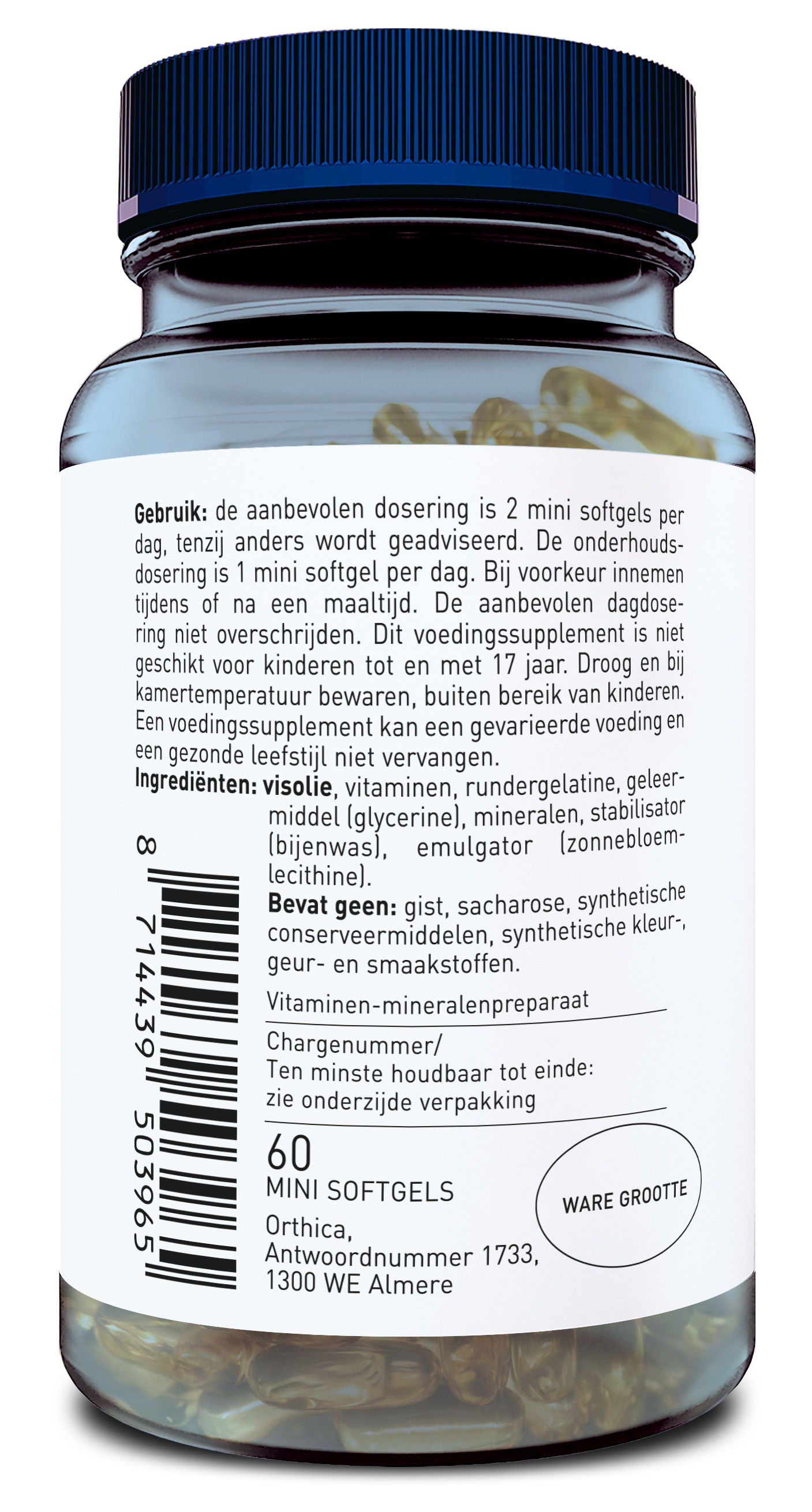 VISolie, vitaminen, rundergelatine, geleermiddel (glycerine), mineralen, stabilisator (bijenwas), emulgator (zonnebloemlecithine)