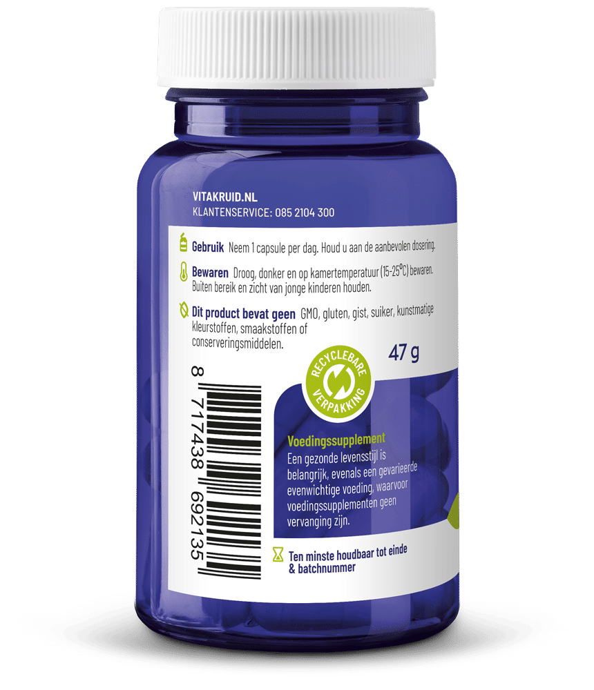 Een gevarieerde, evenwichtige voeding en een gezonde levensstijl zijn belangrijk. Een voedingssupplement is geen vervanging van een gevarieerde voeding.