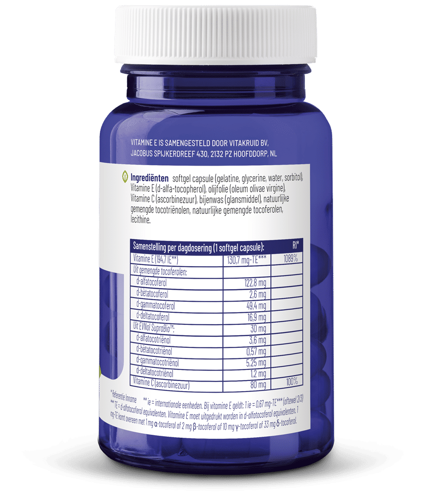 Voor dit Vitamine E Complex heeft Vitakruid uitsluitend gekozen voor natuurlijke vormen van vitamine E. Natuurlijke vormen worden vaak aangeduid met "d-" als voorvoegsel (bijvoorbeeld d-alfa-tocoferol), terwijl synthetische vormen vaak "dl-" bevatten (bijvoorbeeld dl-alfa-tocoferol). Natuurlijke vormen van vitamine E worden beter opgenomen en hebben een grotere biologische activiteit dan synthetische vormen.