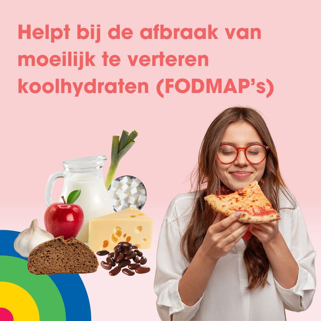 Alpha galactosidase (1200u), xylose isomerase (7500u), capsule: stabilisator (hydroxypropylmethylcellulose), lactase (10.000 FCC), vulstof (calcium carbonaat), invertase (500u).