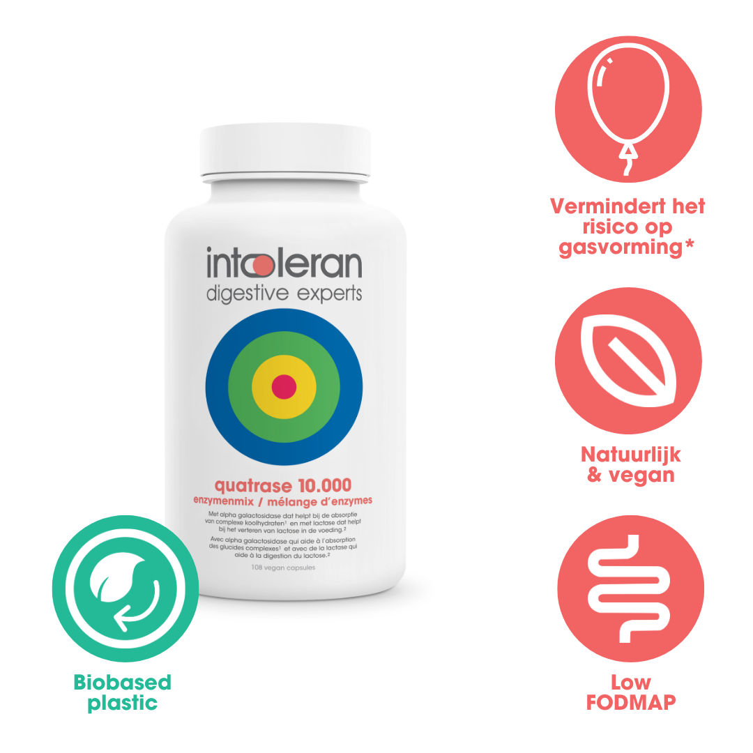 Quatrase 10.000 bevat het Alpha-galactosidase enzym dat helpt bij de vertering van complexe koolhydraten, zoals fructanen en galactanen. Deze komen o.a voor in granen, groentes en peulvruchten en het vermindert het risico op gasvorming*.