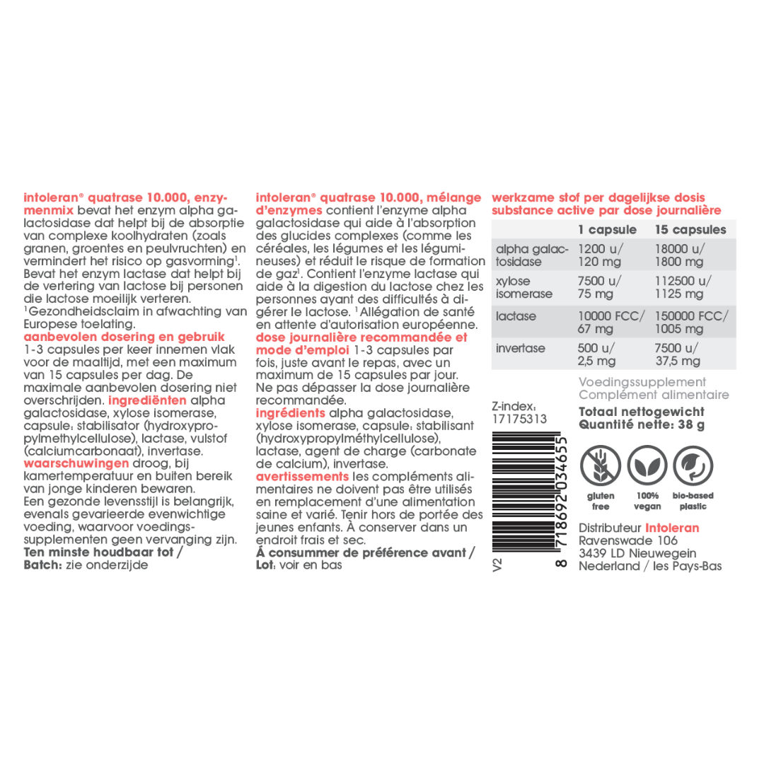 Intoleran quatrase is een voedingssupplement en bevat capsules met vier verschillende verteringsenzymen. Het alpha galactosidase enzym helpt bij de absorptie van complexe koolhydraten uit de voeding en vermindert het risico op gasvorming. Het lactase enzym helpt bij de vertering van lactose bij personen die lactose moeilijk verteren. Bevat ook de verteringsenzymen xylose isomerase en invertase.