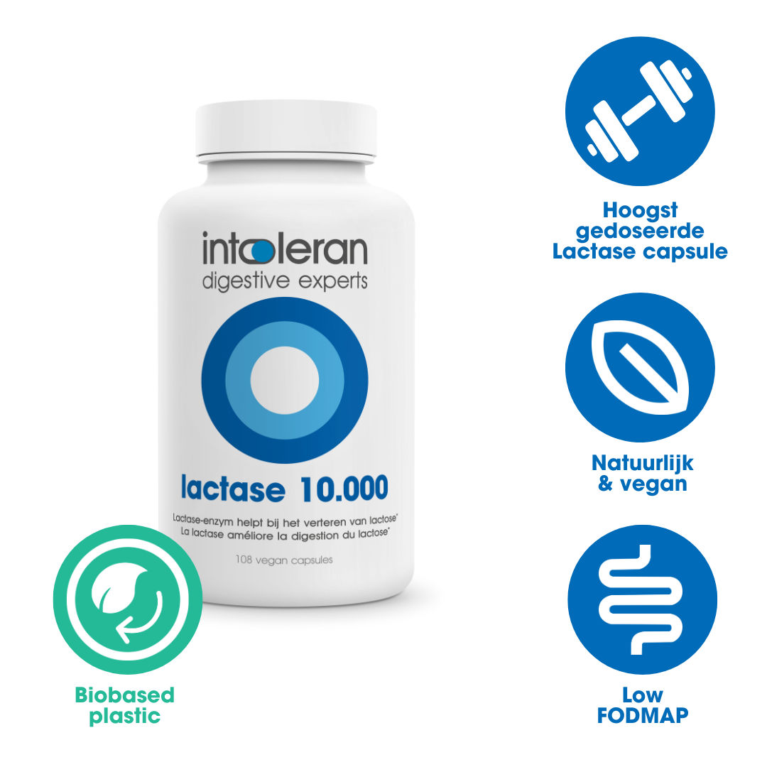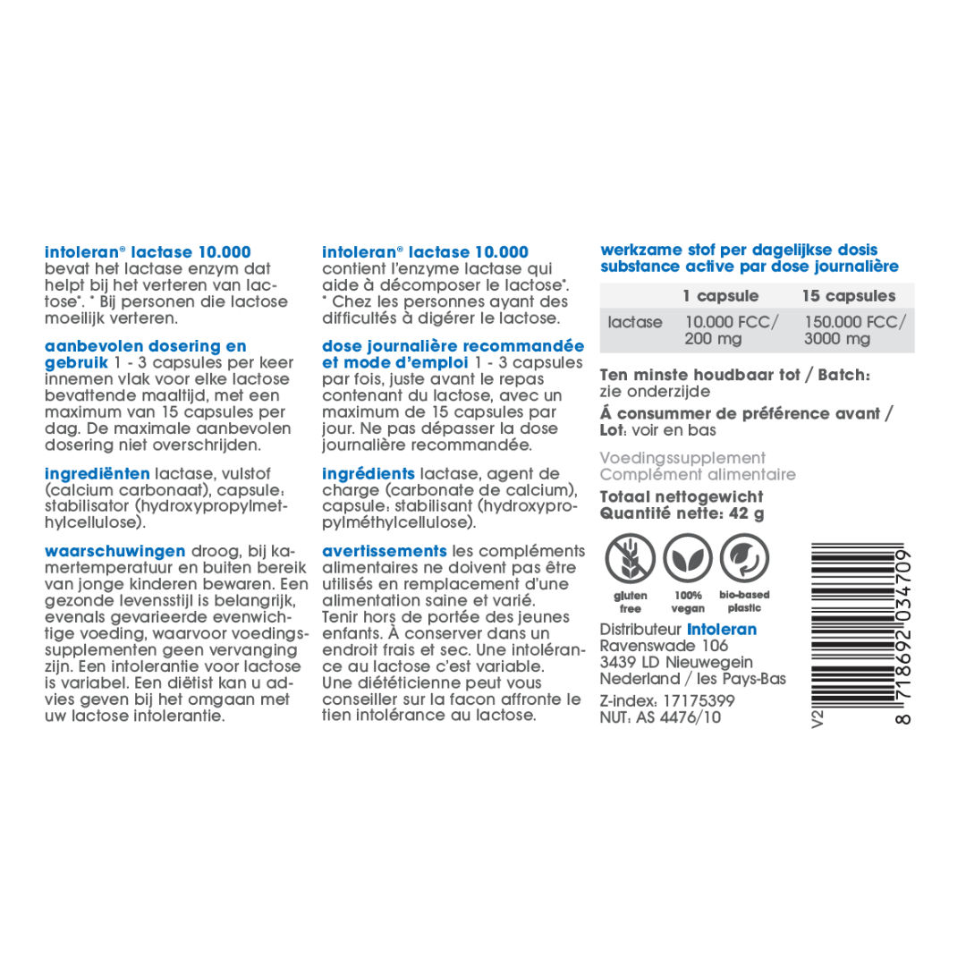 Intoleran lactase 10.000 is een voedingssupplement en bevat capsules met het enzym lactase, 10.000 FCC lactase per capsule.