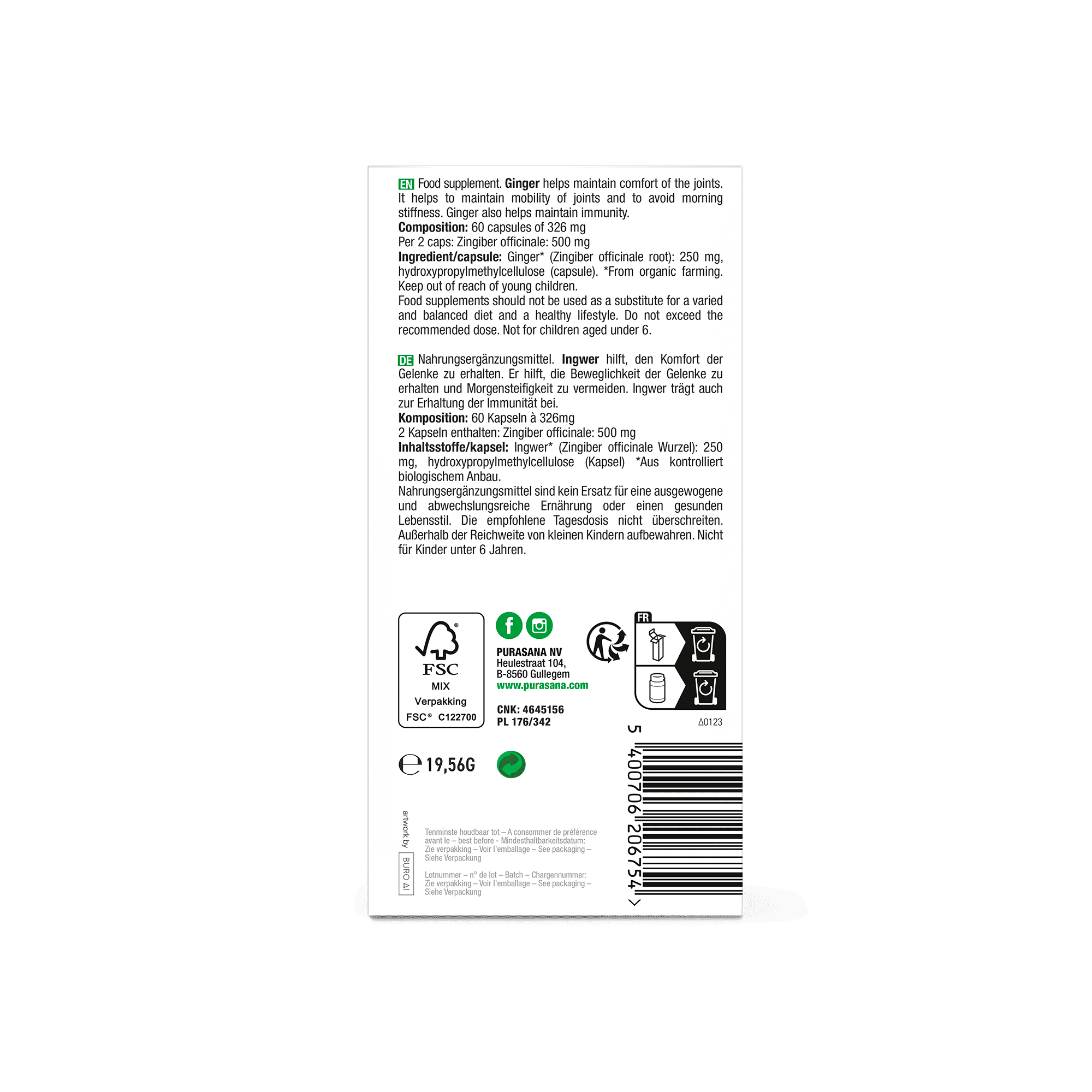 Gember* (wortel Zingiber officinale), hydroxypropylmethylcellulose (capsule).