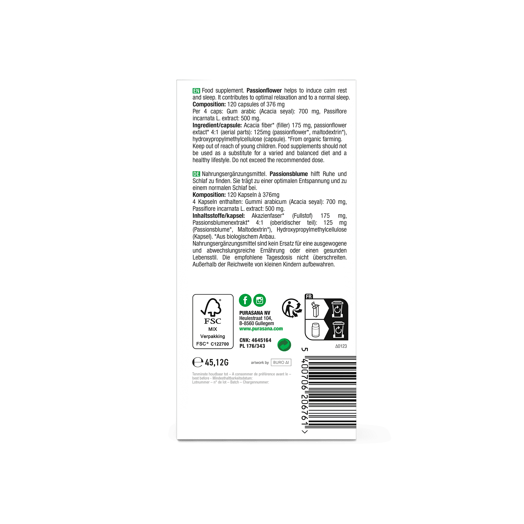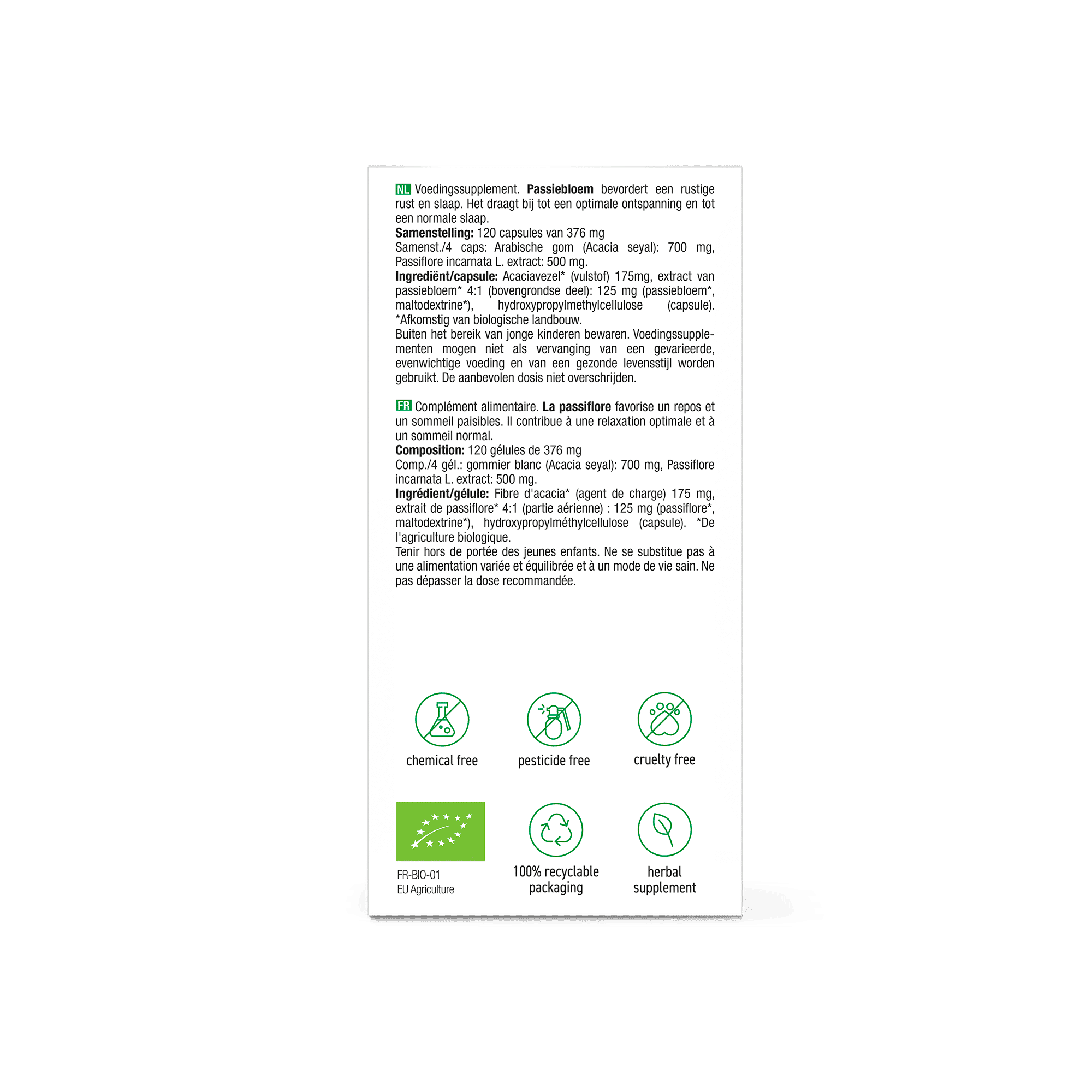 Acaciavezel* (vulstof), extract van passiebloem 4:1 (bovengrondse deel)(passiebloem*, maltodextrine*), hydroxypropylmethylcellulose (capsule).