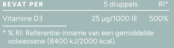 MCT Olie, Vitamine D3 (Cholecalciferol), D-alfa-Tocoferol (antioxidant).