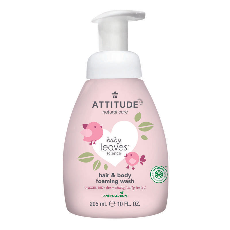 Attitude Baby Leaves 2-In-1 haar en body Foaming Wash is gemaakt van natuurlijke ingrediënten zoals bosbessenblaadjes om de sterk absorberende huid van baby's te verzorgen. Deze licht schuimende en parfumvrije formule is EWG Verified, niet-irriterend en mild genoeg om dagelijks te gebruiken.