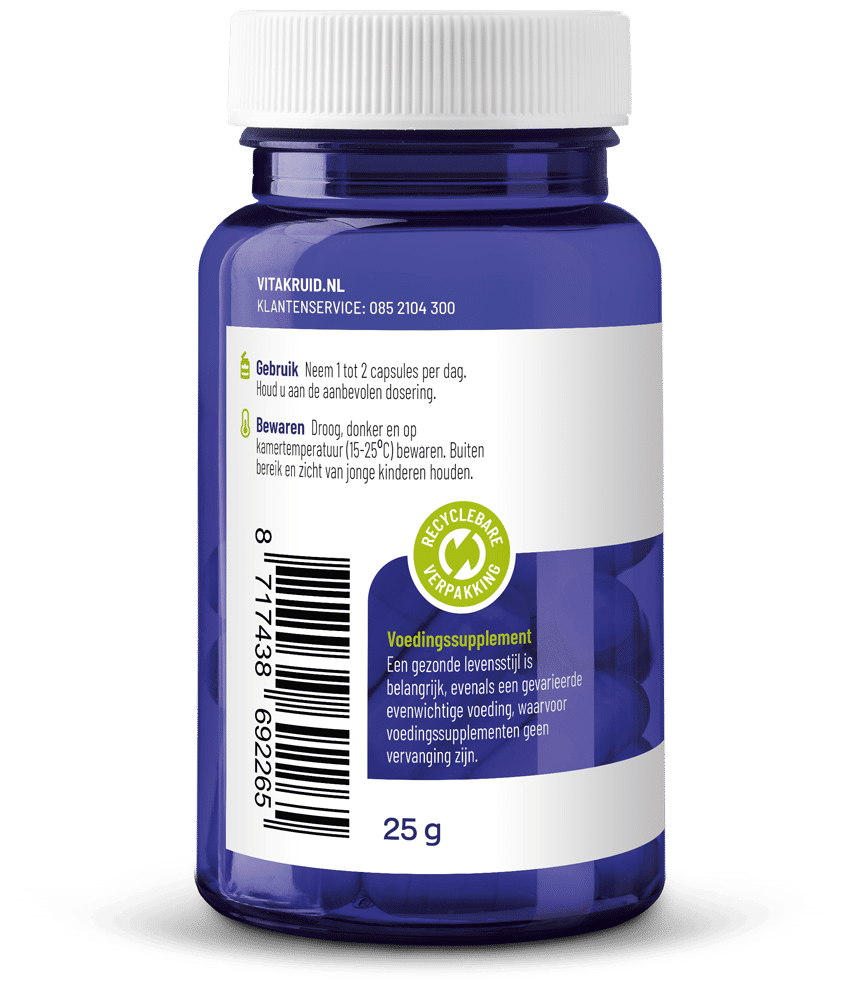 Een gevarieerde, evenwichtige voeding en een gezonde levensstijl zijn belangrijk. Een voedingssupplement is geen vervanging van een gevarieerde voeding.