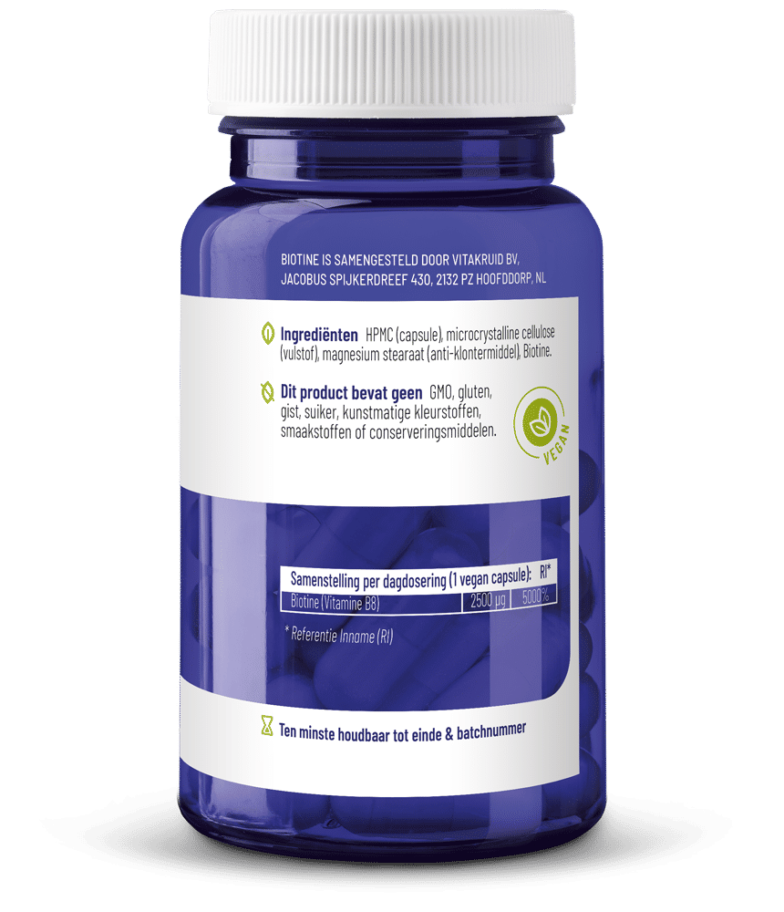 HPMC (capsule), microcrystalline cellulose (vulstof), magnesium stearaat (anti-klontermiddel), Biotine.