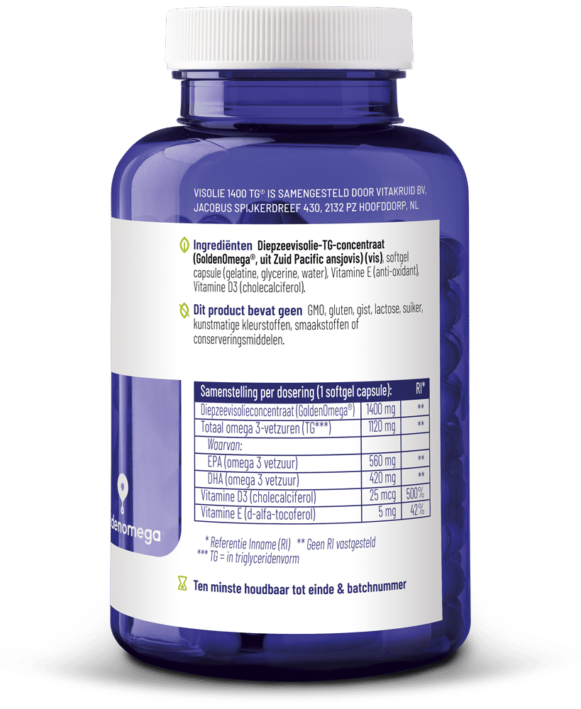 Tijdens het tweede (hoogwaardige) proces zet men de stoffen terug in de originele molecuulstructuur, oftewel triglyceriden. Dit is de natuurlijke vorm van omega 3 met de hoogste biologische beschikbaarheid. Dat betekent dat ons lichaam deze vorm het beste opneemt, zonder de noodzaak van hulpstoffen. Daarom bevat Visolie 1400 TG met D3 ook uitsluitend triglyceriden.