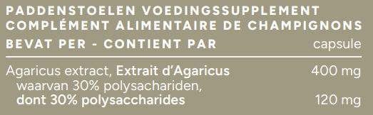 100% Biologisch Champignon 8:1 extract (Agaricus Bisporus, vruchtlichaam) (SULFIET), HPMC vegetarische capsule (huls).