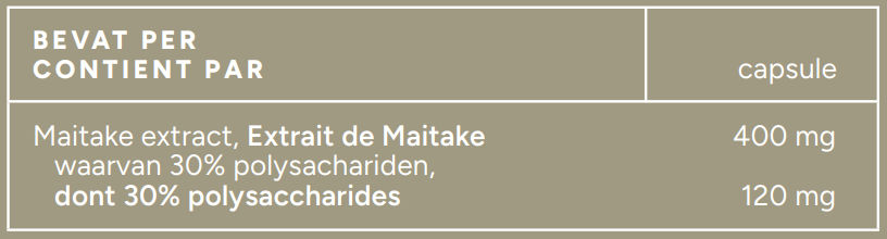 100% Biologisch Maitake 12:1 extract (Grifola frondosa, vruchtlichaam), HPMC vegetarische capsule (huls), Nu-flow (anti-klontermiddel).