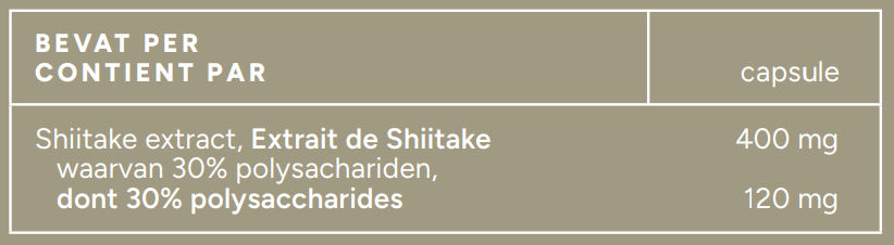 100% Biologisch Shiitake 11:1 extract (Lentinula edodes, vruchtlichaam), HPMC vegetarische capsule (huls), Nu-flow (antiklontermiddel).