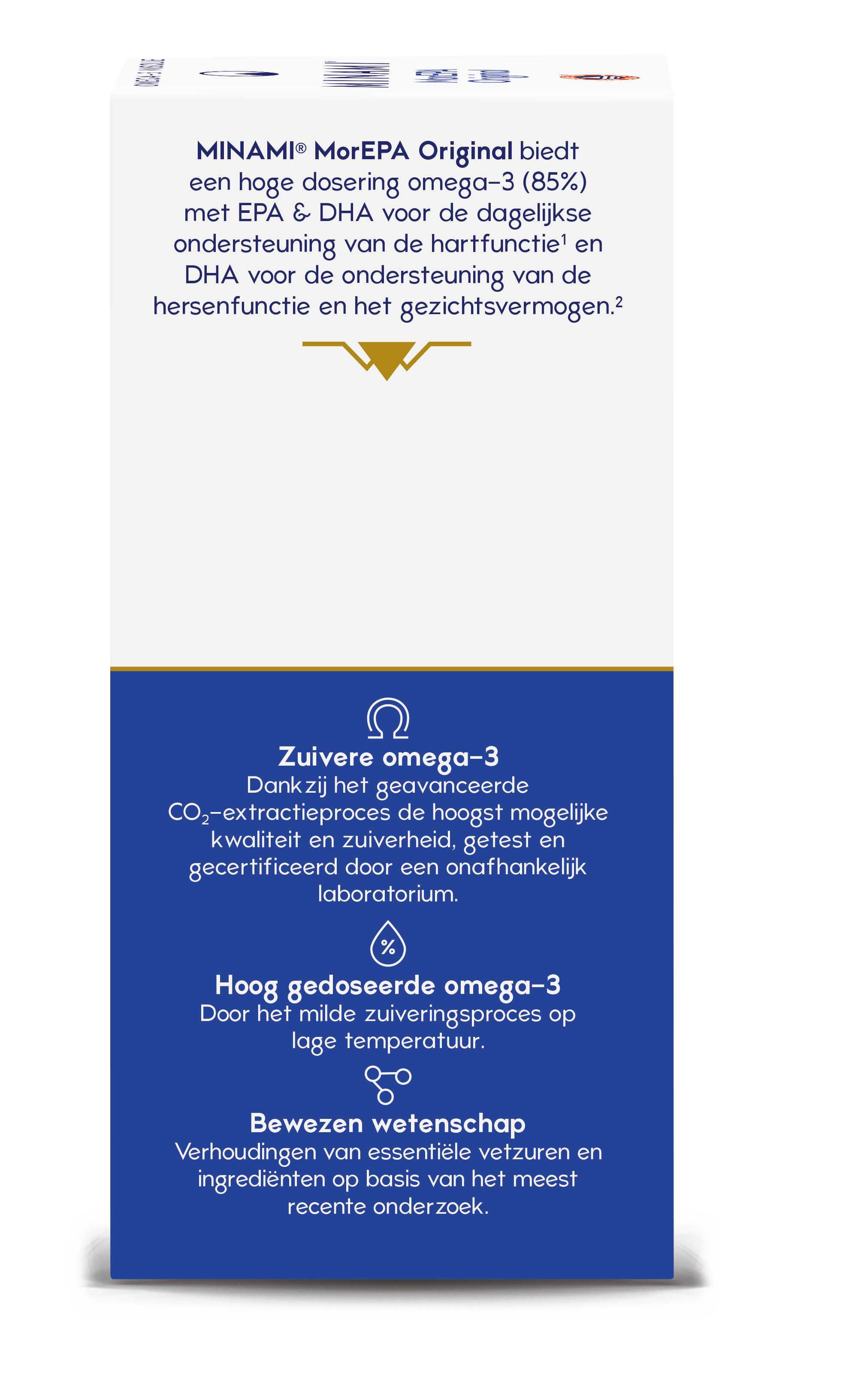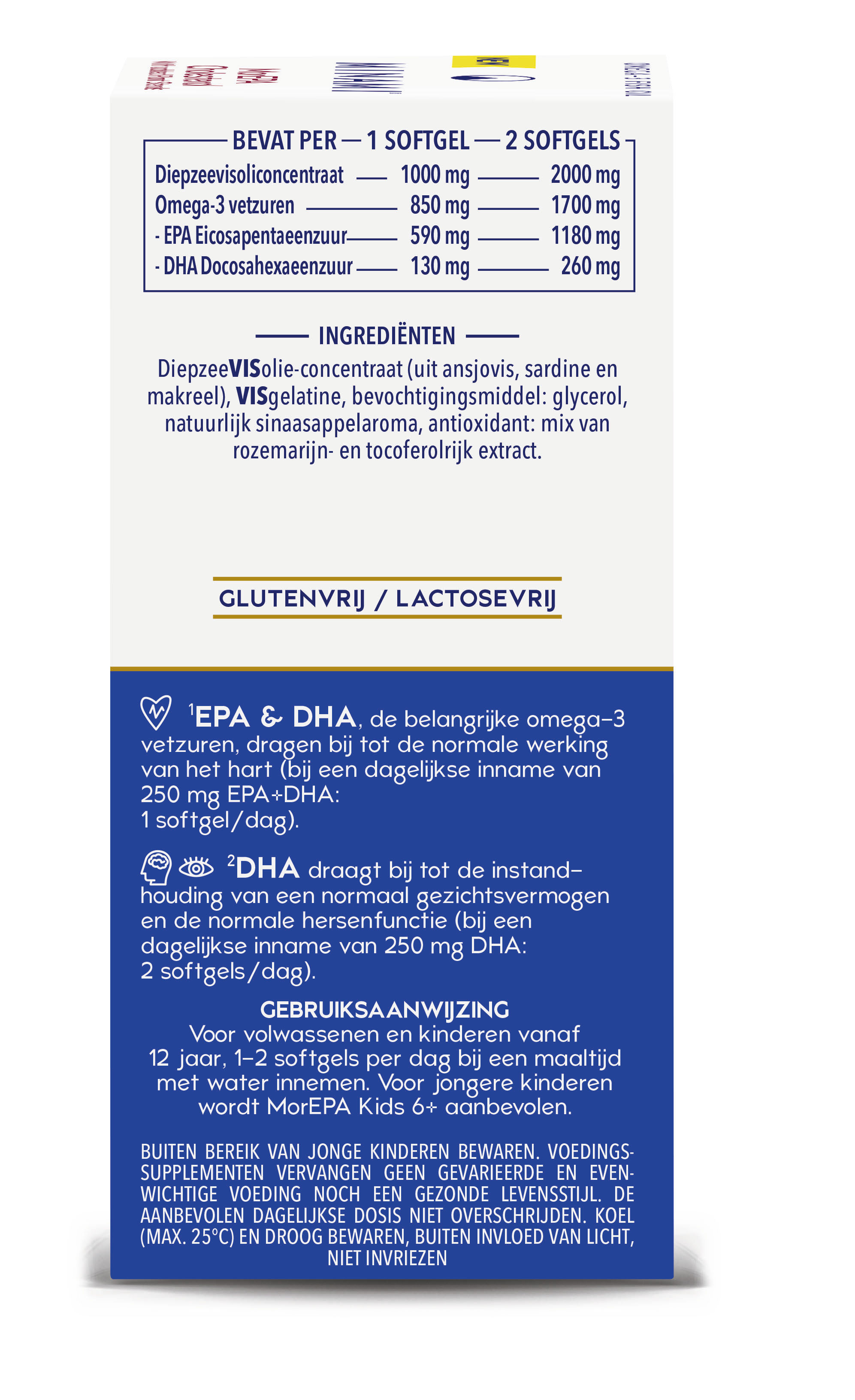 - De belangrijke omega-3 vetzuren, dragen bij tot de normale werking van het hart (bij een dagelijkse inname van 250 mg EPA+DHA: 1 softgel/dag).