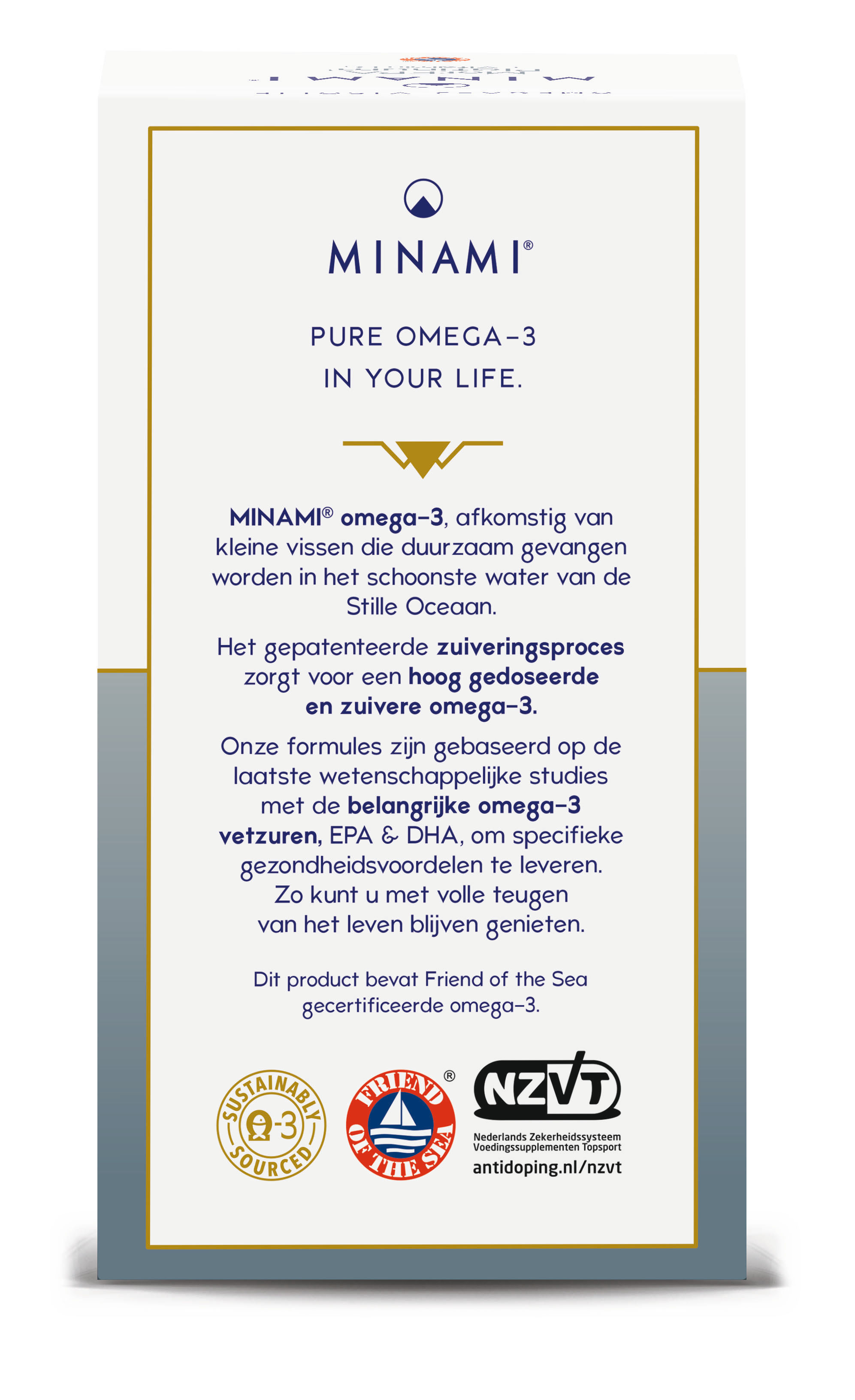 Minami omega-3, afkomstig van kleine vissen die duurzaam gevangen worden in het schoonste water van de Stille Oceaan.