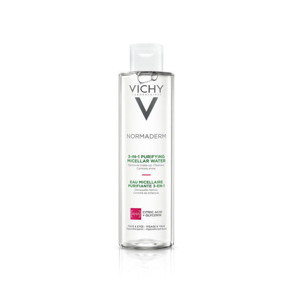 De ideale reiniging voor een gevoelige en tegelijkertijd vette huid, Vichy’s Normaderm Micellaire Reinigingslotion.