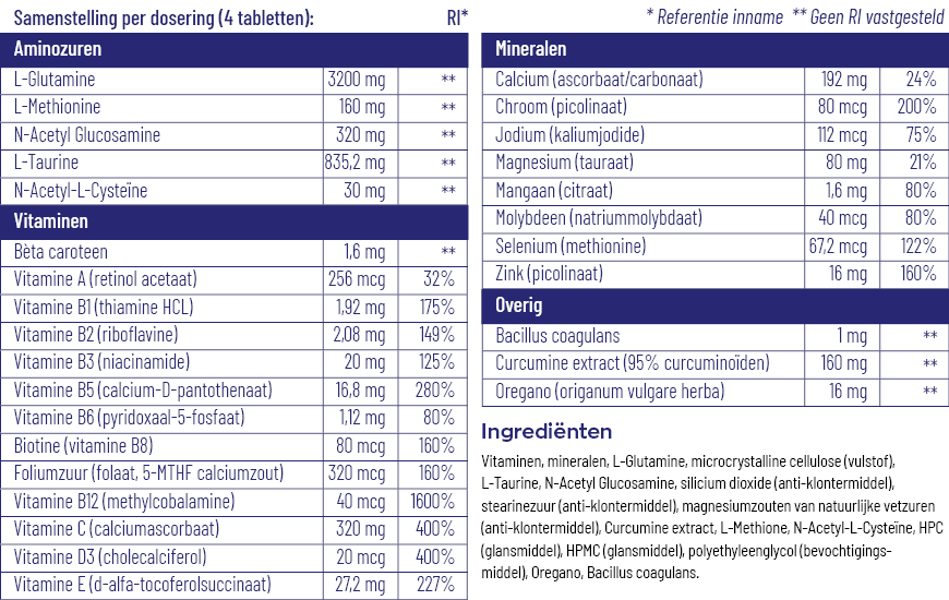 Vitaminen, mineralen, L-Glutamine, microcrystalline cellulose (vulstof), L-Taurine, N-Acetyl Glucosamine, Curcumine extract, L-Methione, Alfa-liponzuur, magnesium stearaat (anti-klontermiddel), HPMC (glansmiddel), polyethyleenglycol (bevochtigingsmiddel), Oregano, Bacillus coagulans