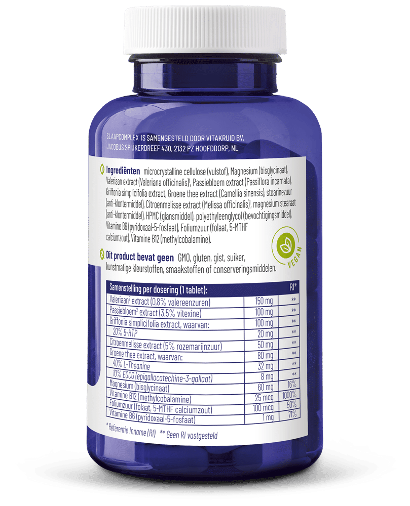 Valeriaan, passiebloem, citroenmelisse en groene thee vormen het hart van SlaapComplex. Griffonia simplicifolia – ook bekend als slaapmutsjeskruid – is een Afrikaanse plant die van nature een hoge concentratie 5-hydroxytryptofaan (5-HTP) bevat. Dit 5-HTP is de omgezette vorm van het essentiële aminozuur tryptofaan. De stof fungeert als een tussenstap bij de ontwikkeling van tryptofaan naar serotonine. 5-HTP dient als een bouwsteen voor serotonine en is daarmee een voorloper van melatonine.