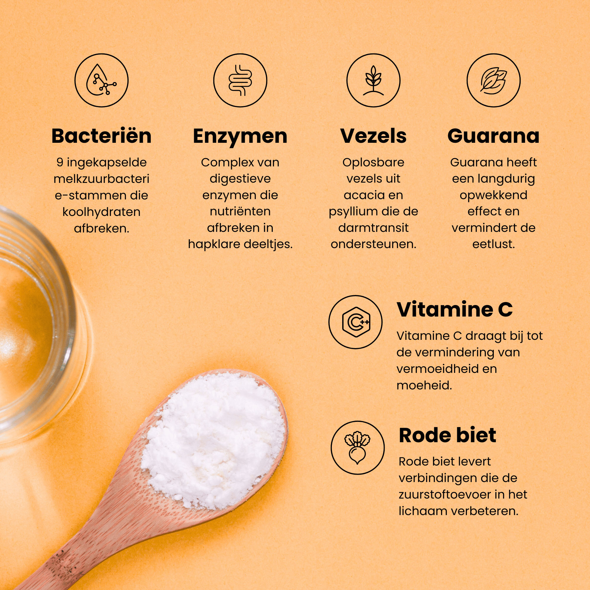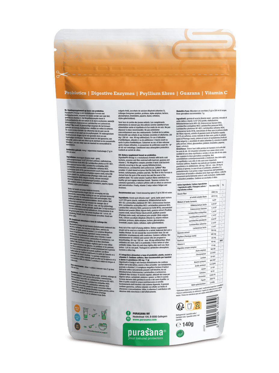 Acaciagom (Acacia seyal - gom), melkzuurgistmengsel 1x109 CFU kiem (zetmeel, maltodextrine, Bifidobacterium lactis W51-52, Lactobacillus plantarum W1-W21, Enterococcus faecium W54, Lactobacillus acidophilus W22, Lactobacillus paracasei W20, Lactobacillus salivarius W24, Lactococcus lactis W19), geconcentreerd zwarte bespoeder (Ribes nigrum-fruit), guaranaextract (Paullinia cupana-zaad), natuurlijk aroma zwarte bes, psylliumpoeder (Plantago ovata-zaad), rode bietensappoeder (Beta vulgaris-vrucht), calcium ascorbaat dihydraat (Vitamine C), enzymmengsel (amidon, protease, alfa-amylase, lactase, glucoamylase, bromelaïne, papaïne, lipase, cellulase, alpha-galactosidase).