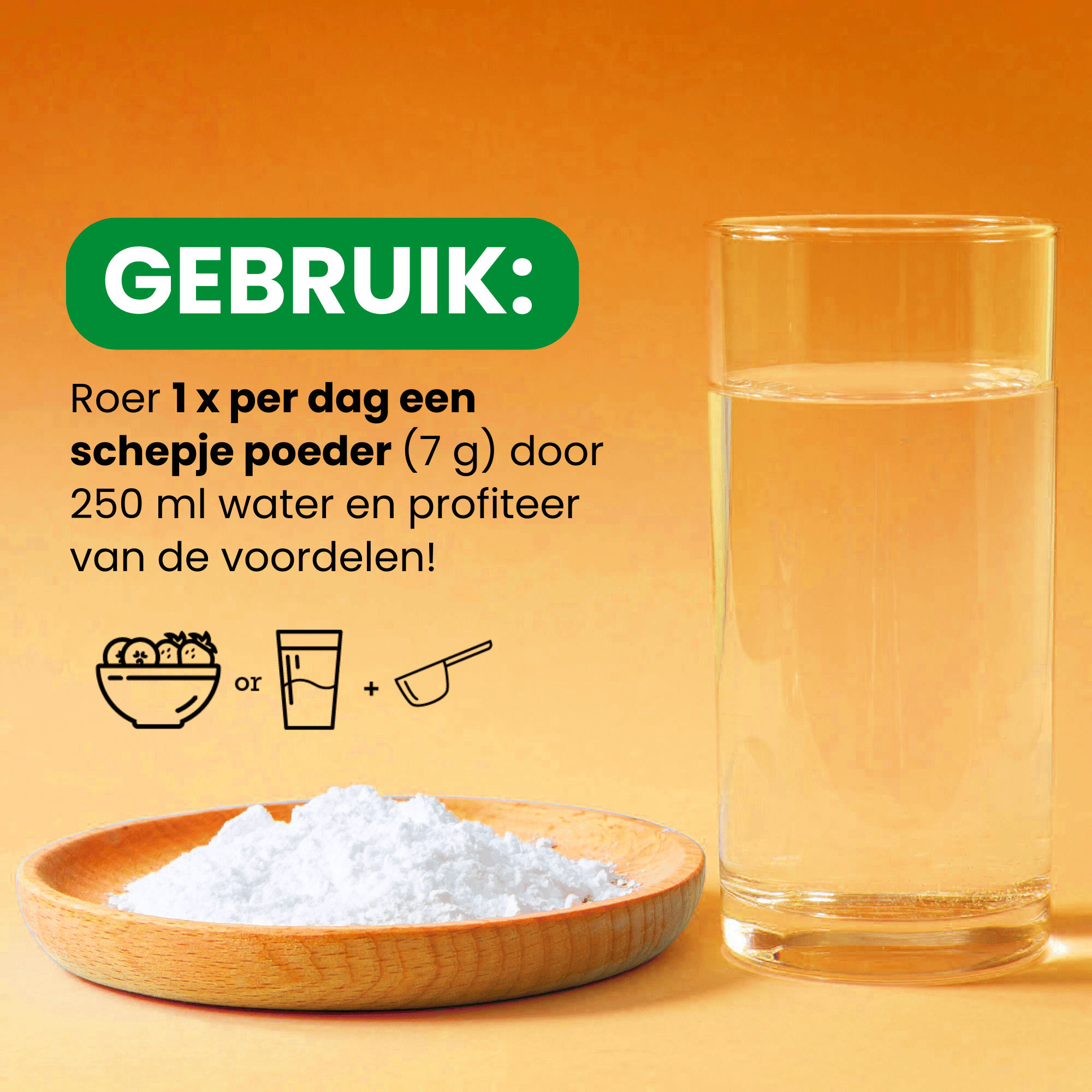 Voeg voor gebruik 7 g poeder toe aan 250 ml water. Roer en het product is klaar voor gebruik. Geschikt voor dagelijks gebruik!