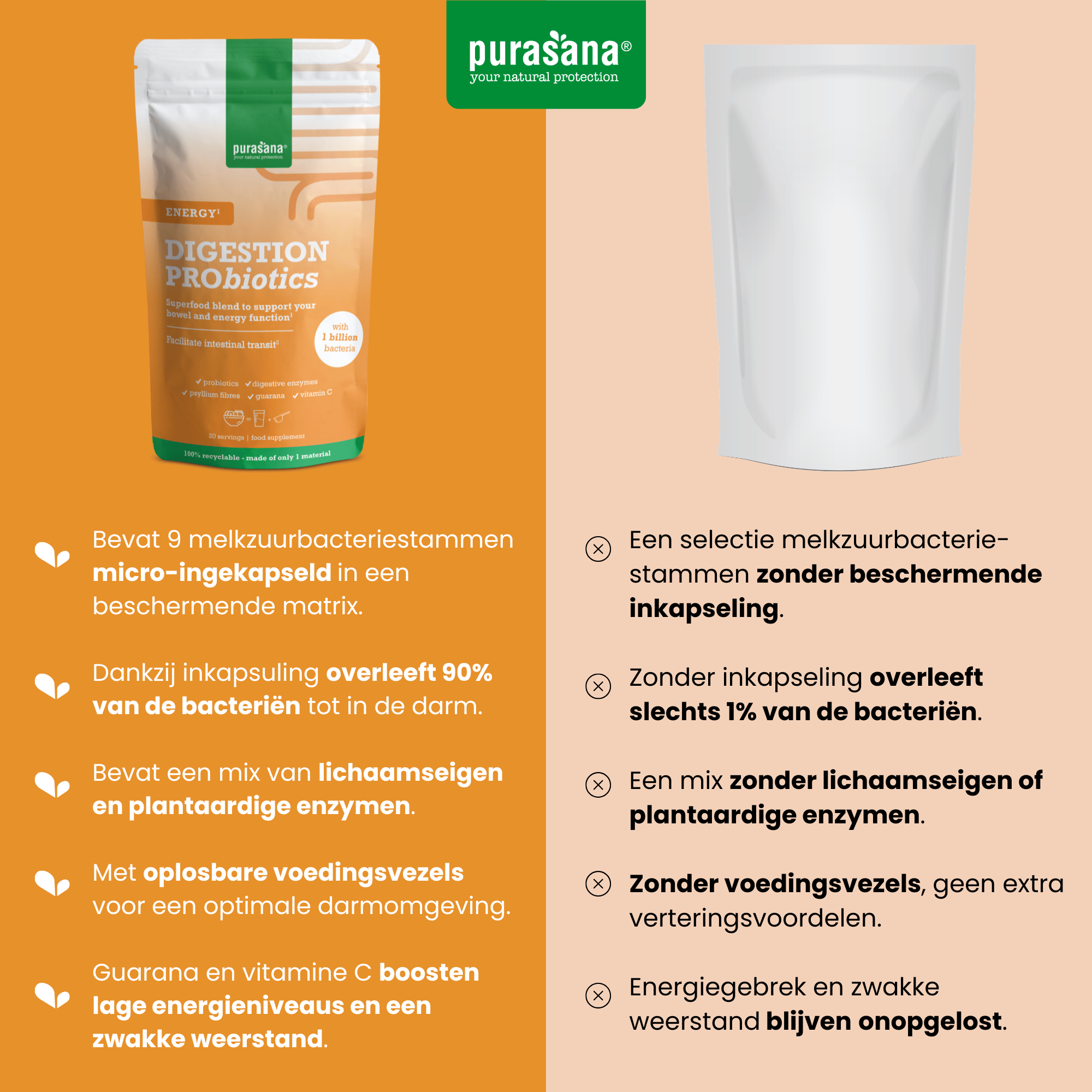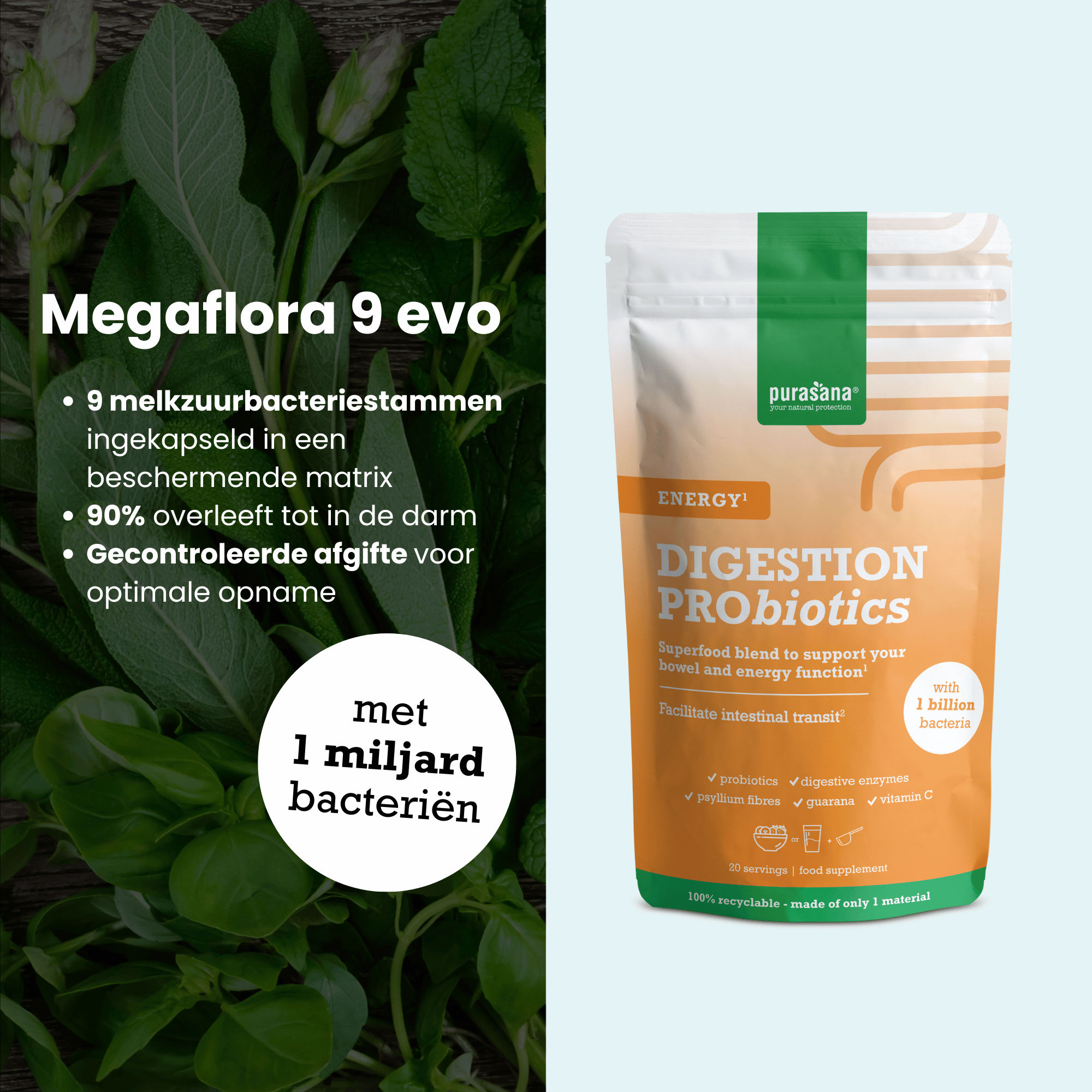 Energy bevat met Megaflora 9 bacteriestammen die van nature in de darm voorkomen. Deze levende bacteriën zitten ingekapseld in een matrix die de bacteriën beschermen tegen invloeden van buitenaf. Dankzij die inkapseling overleven 90% van die bacteriën doorheen de spijsvertering. Die overlevingskans wordt uitgedrukt in de eenheid CFU/g, wat staat voor “kolonievormende eenheden per gram”.
