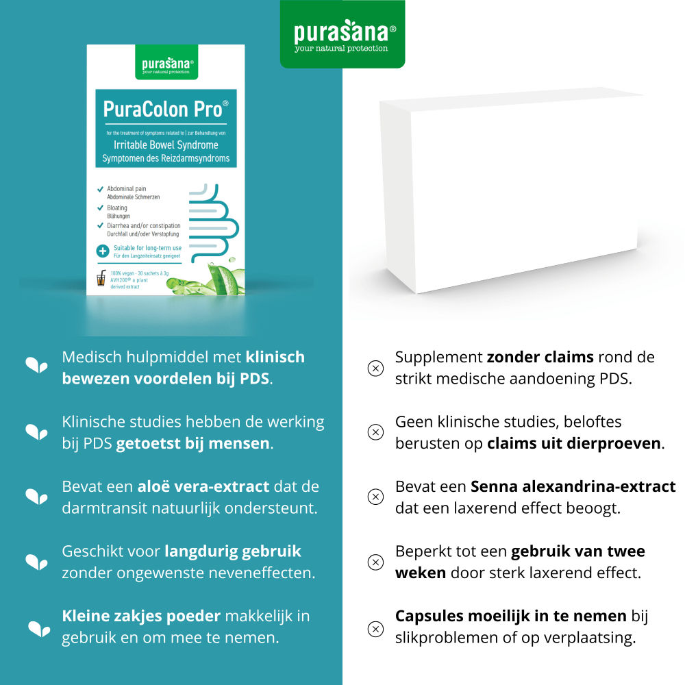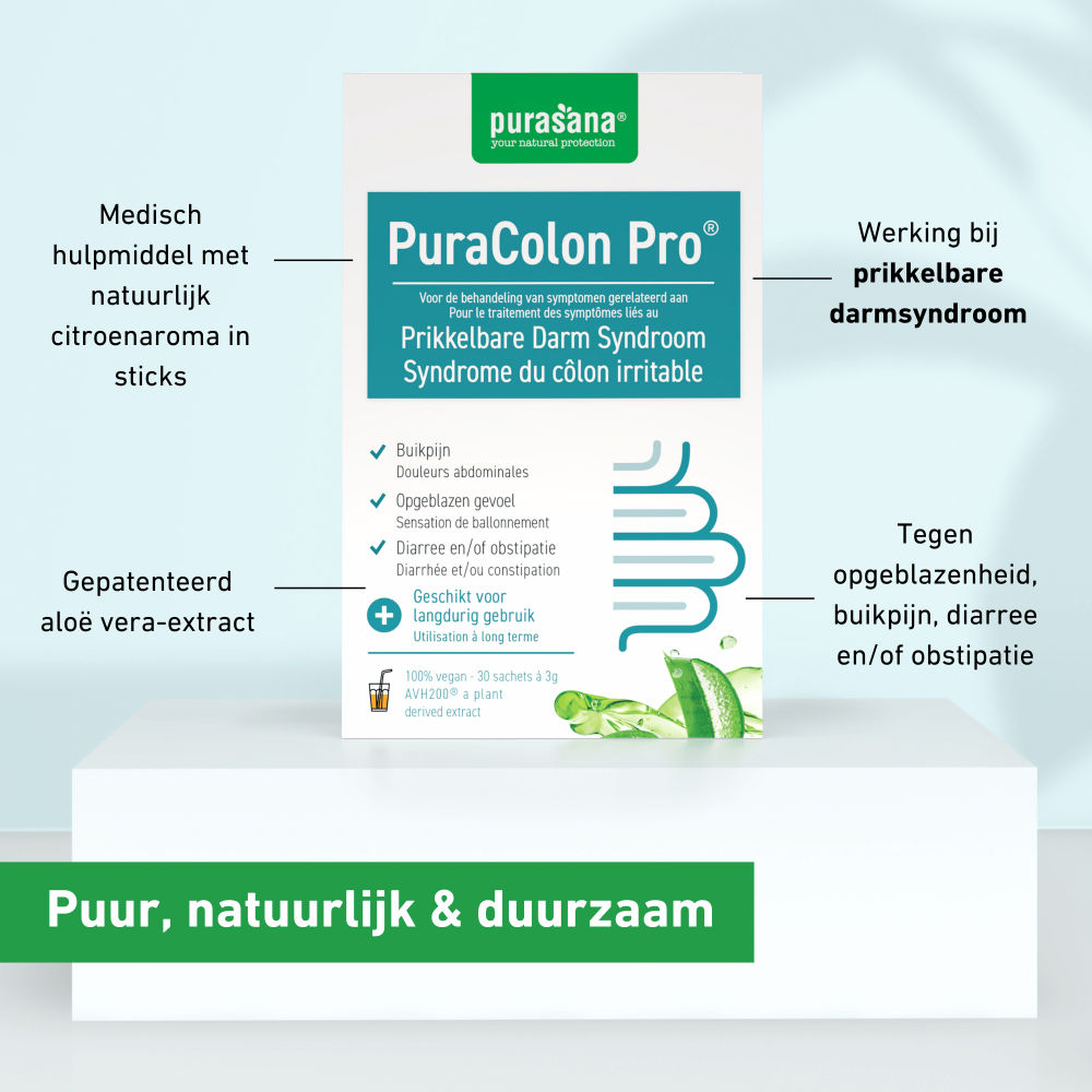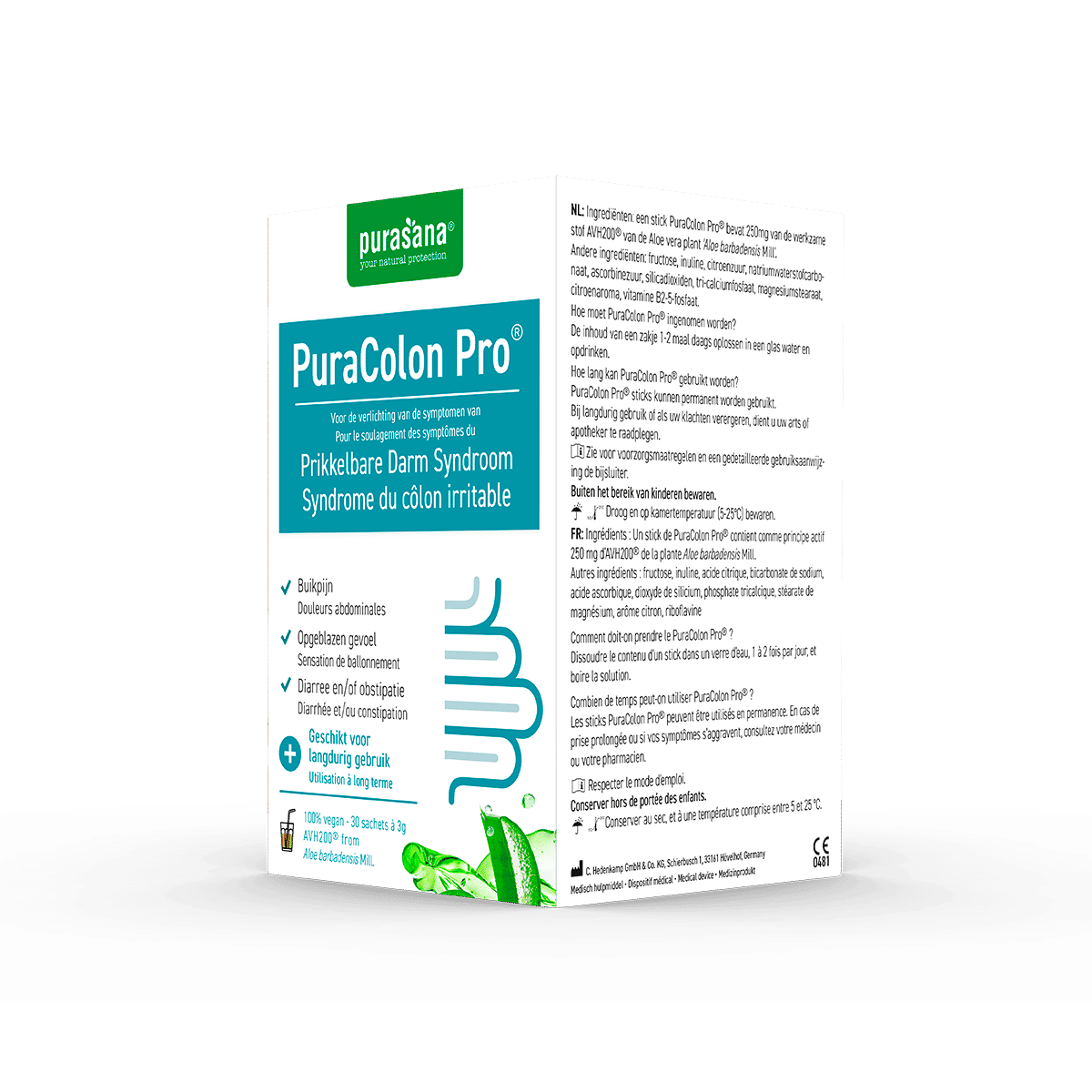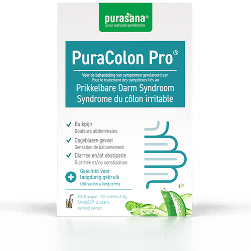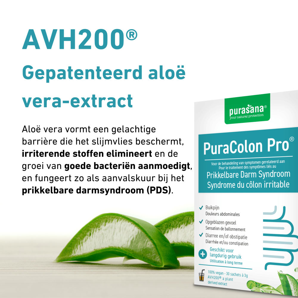 PuraColon Pro is een medisch hulpmiddel op basis van een gepatenteerd aloë vera-extract (AVH200®). Dit medisch hulpmiddel heeft een bewezen werking bij het verlichten van PDS symptomen zoals buikpijn, een opgeblazen gevoel en diarree/obstipatie.