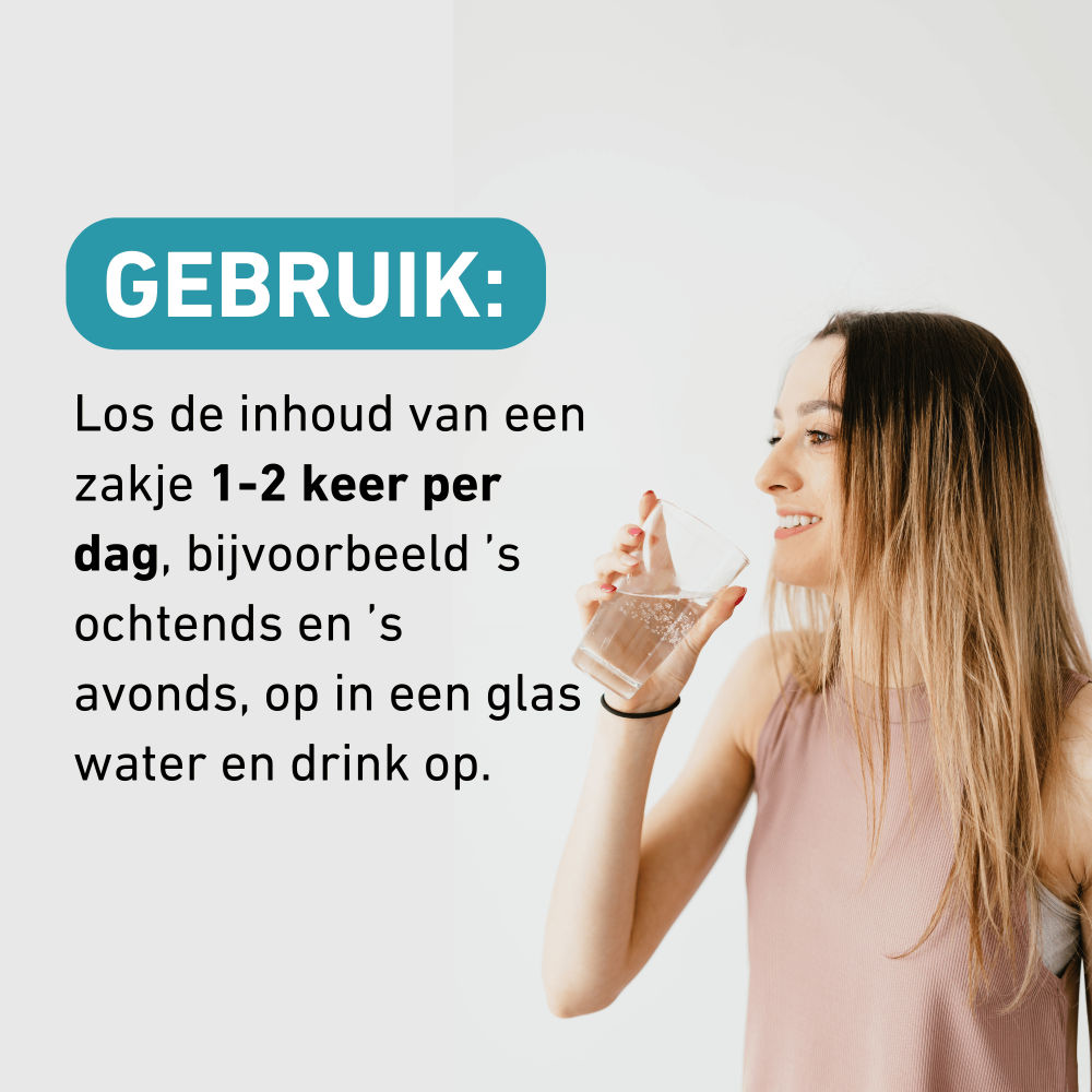 Los de inhoud van een zakje 1-2 keer per dag, bijvoorbeeld ’s ochtends en ’s avonds, op in een glas water en drink op.