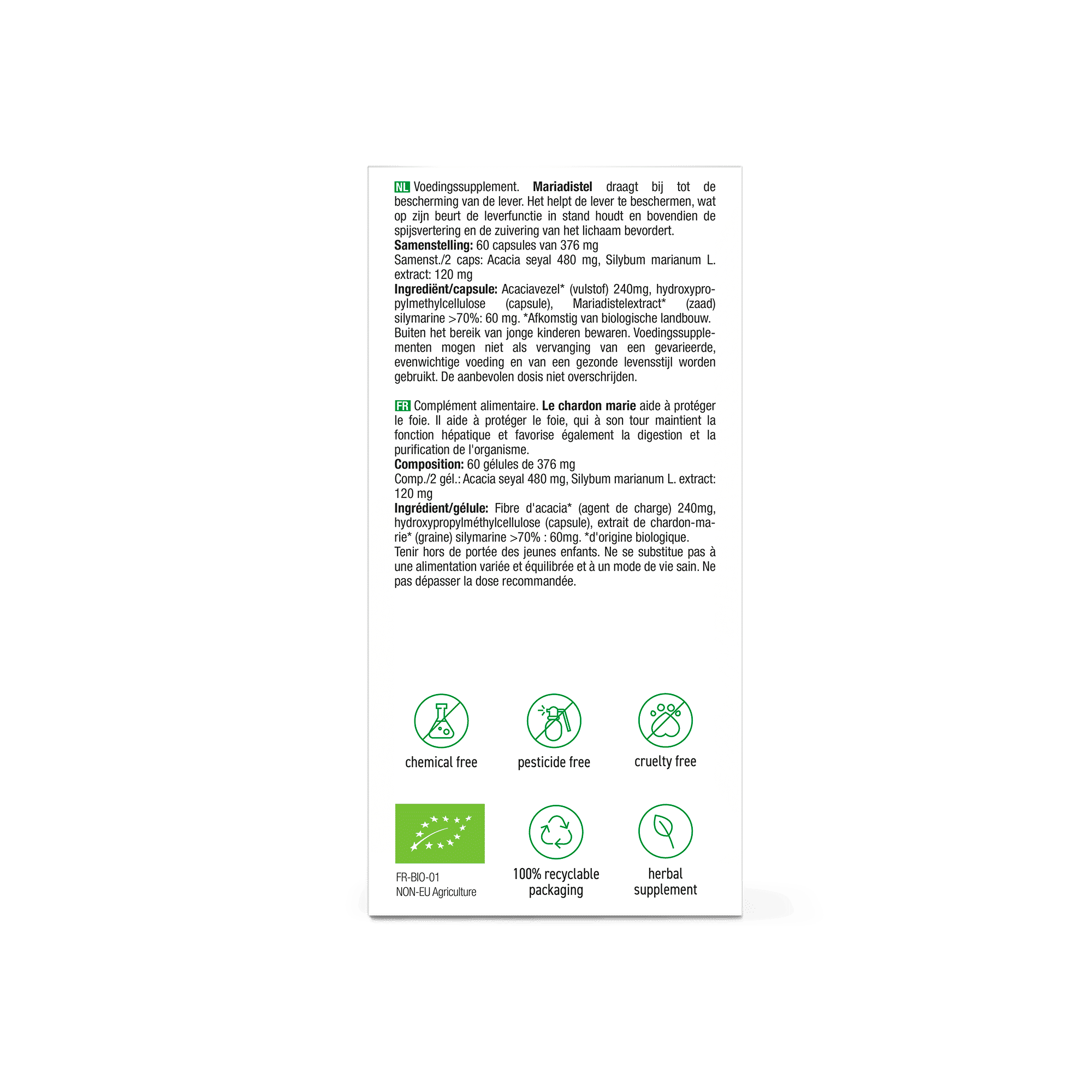 Acaciavezel* (vulstof), Mariadistelextract* (zaad) silymarine >50%, hydroxypropylmethylcellulose (capsule).