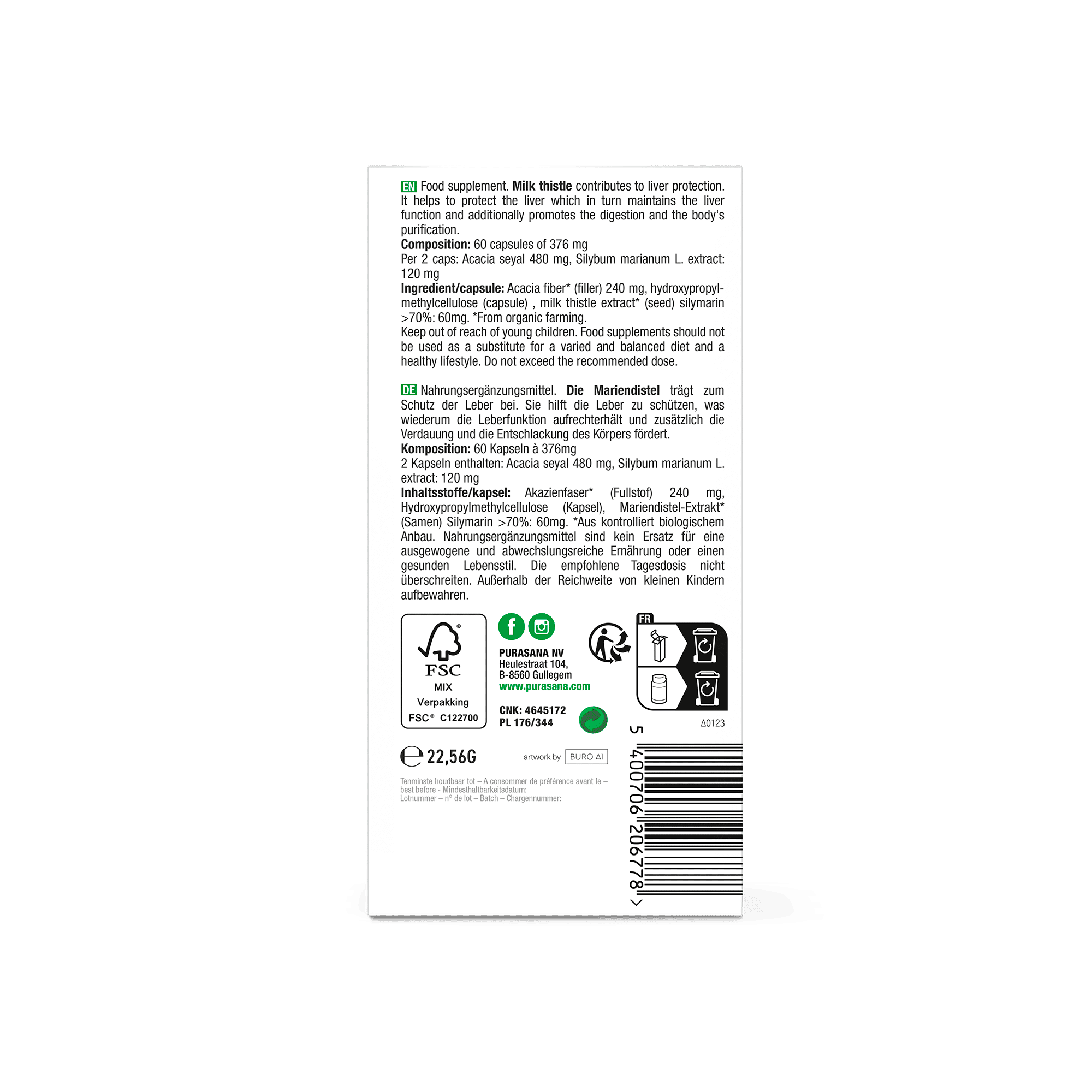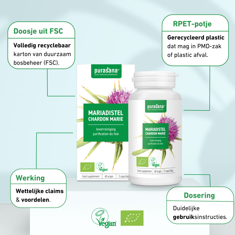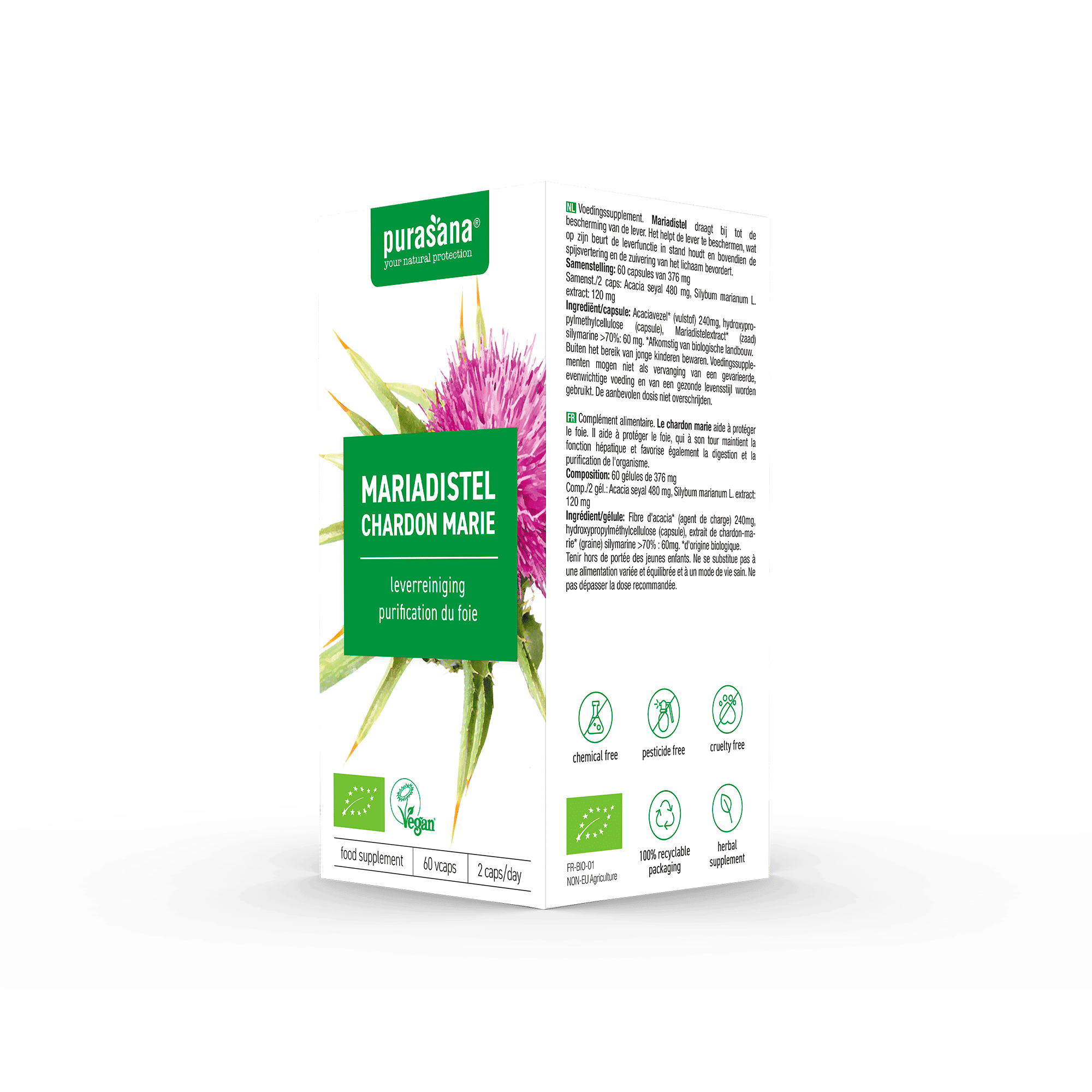 Purasana Mariadistel Capsules is een vegan voedingssupplement dat gemaakt is van het zaad van de Silybum mariamum (Mariadistel).