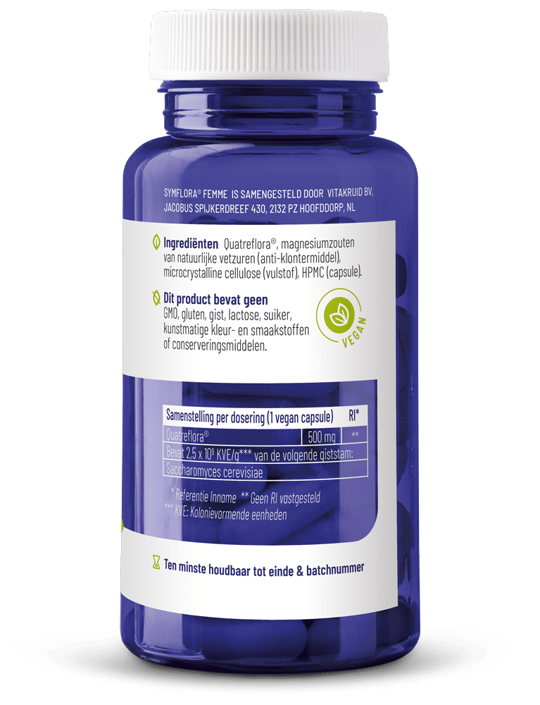 Probiotica worden vaak gekweekt op melkproducten waardoor ze niet passen in een veganistische levensstijl. De Saccharomyces cerevisiae wordt echter gekweekt op een plantaardige voedingsbodem, zoals suikerbieten of suikerriet. Symflora® Femme is daarom ook geschikt voor veganisten!