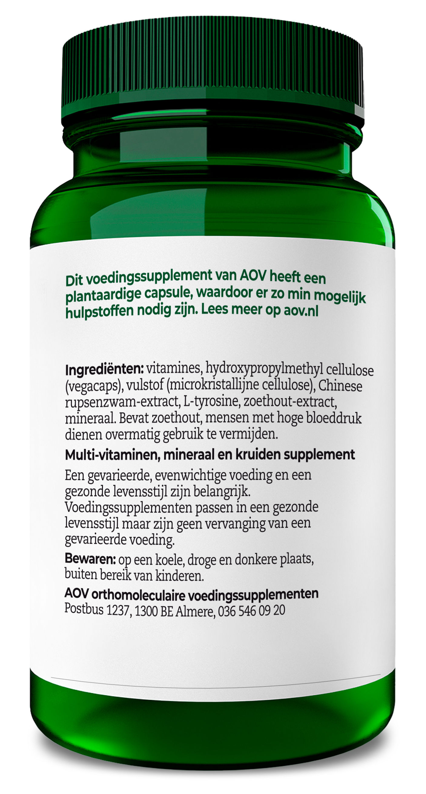 Vitamines, hydroxypropylmethyl cellulose(vegacaps), vulstof (microkristallijne cellulose), Chinese rupsenzwam-extract, L-tyrosine, zoethout-extract, mineraal.