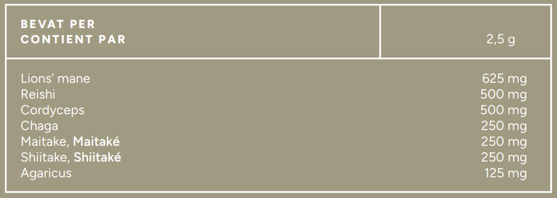 Lion’s Mane poeder (Pruikzwam, Hericium erinaceus, full-spectrum vruchtlichaam)*, Reishi poeder (Ganoderma lucidum, vruchtlichaam)*, Cordyceps poeder (Cordyceps sinensis, full-spectrum mycelium biomassa)*, Chaga poeder (Inonotus obliquus, vruchtlichaam)*, Maitake poeder (Grifola frondosa, vruchtlichaam)*, Shiitake poeder (Lentinula edodes, vruchtlichaam)*, Champignon poeder (Agaricus Bisporus, vruchtlichaam)*. Bevat van nature SULFIET.