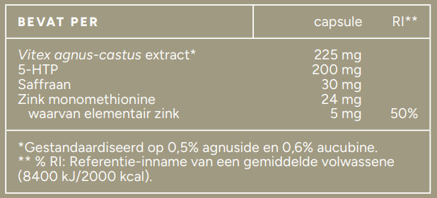 5-HTP (Griffionazaad extract 30%, Griffonia simplicifolia), Monnikspeper (Vitex agnus-castus L. extract, vrucht), HPMC vegetarische capsule (huls), affron® Saffraan (Crocus Sativus L. stigmas extract (Std. to 3.5% Lepticrosalides® by HPLC) (drager: maltodextrine)), Vegan MCT poeder, Zinkmono-L-methioninesulfaat.