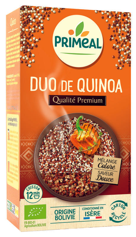 Priméal is sinds 1989 een quinoa pionier en heeft deze echte quinoa geselecteerd om zijn eersteklas kwaliteit en onnavolgbare smaak. Priméal Quinoa Duo is een combinatie van echte witte quinoa, bekend om zijn zachte smaak en zachte textuur, en echte rode quinoa, met een stevigere textuur en mooie rode kleur. Quinoa is een bron van proteïnen en vezels.