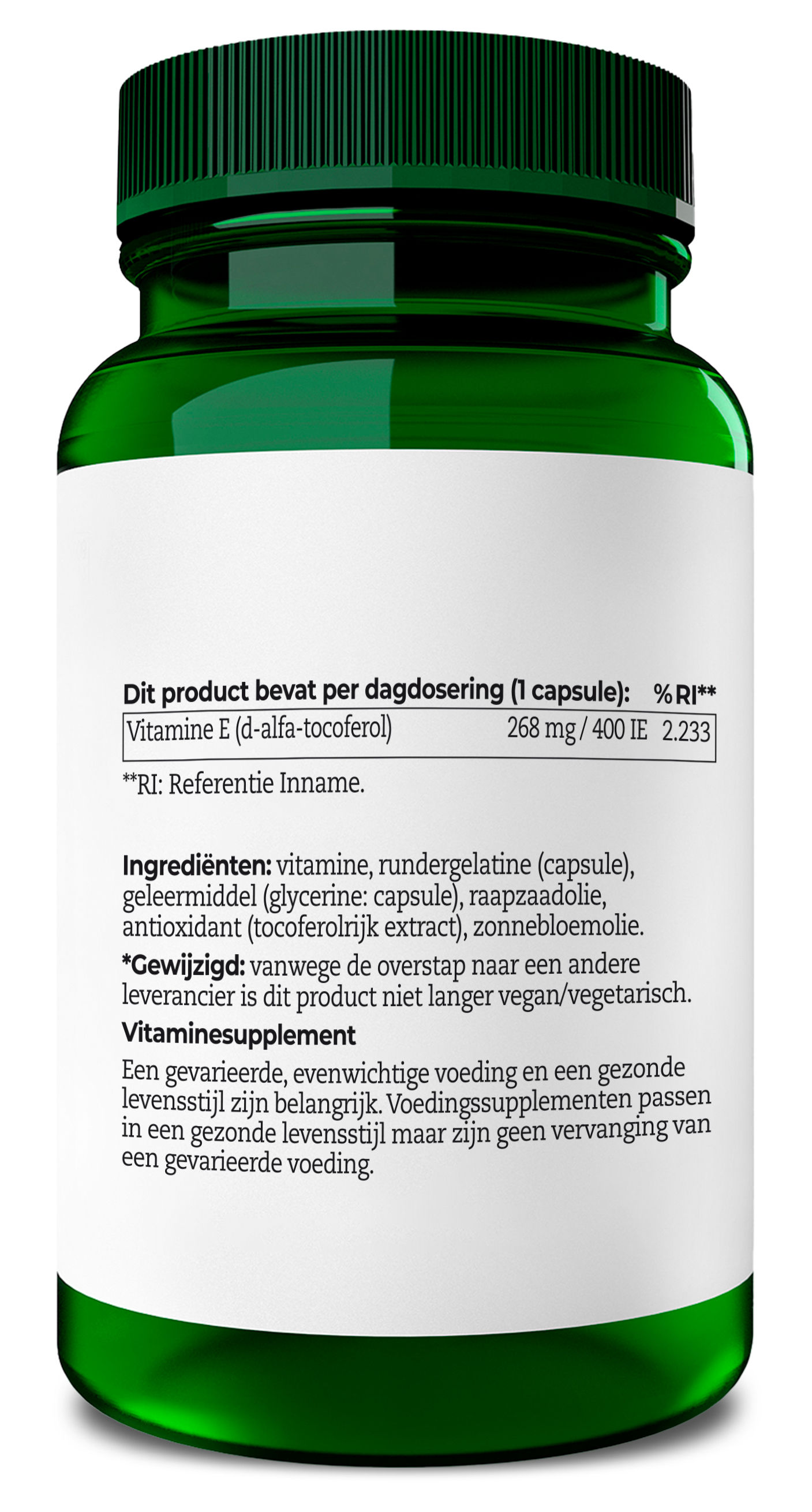 Vitamine E (d-alfa-tocoferol), rundergelatine (capsule), geleermiddel (glycerine: capsule), raapzaadolie, antioxidant (tocoferolrijk extract), zonnebloemolie
