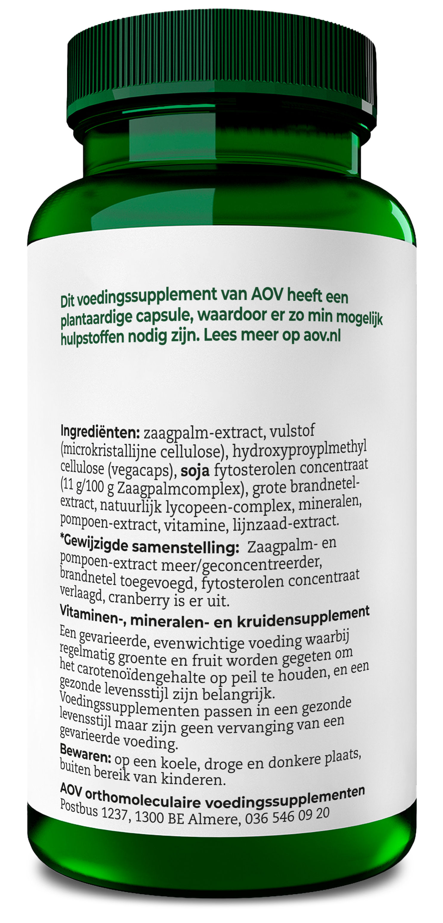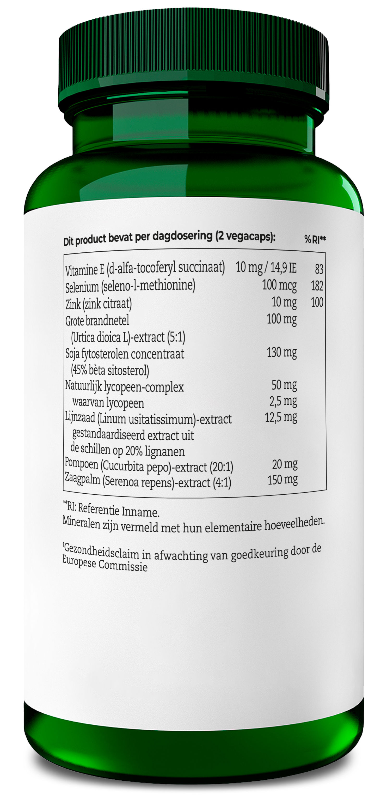 Zaagpalm-extract,vulstof (microkristallijne cellulose), hydroxyproyplmethyl cellulose (vegacaps), SOJA fytosterolen concentraat(11 g/100 g Zaagpalmcomplex), grote brandnetel-extract, natuurlijk lycopeen-complex, mineralen, pompoen-extract, vitamine, lijnzaad-extract.