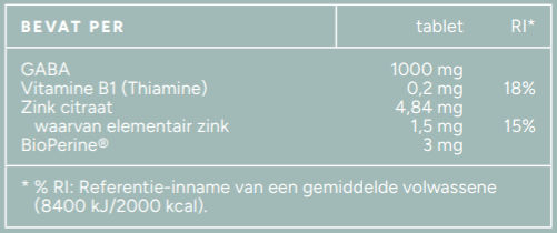 GABA (Gamma-aminoboterzuur), micro - kristallijne cellulose (vulstof), natuurlijk calcium carbo-naat (vulstof), vegetarische olie (verdikkingsmiddel), vetzuurzouten (anti-klontermiddel), HPC plantvezels