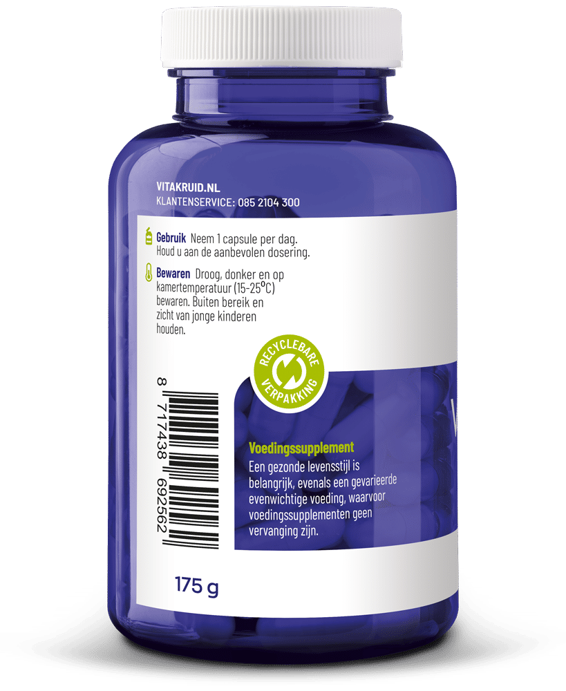 Een gevarieerde, evenwichtige voeding en een gezonde levensstijl zijn belangrijk. Een voedingssupplement is geen vervanging van een gevarieerde voeding.