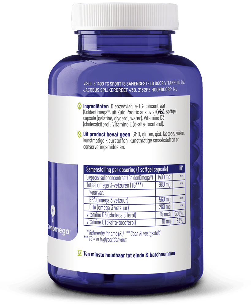 Visolie 1400 TG Sport bevat geen: GMO, gluten, gist, lactose, suiker, kunstmatige kleurstoffen, smaakstoffen of conserveringsmiddelen.