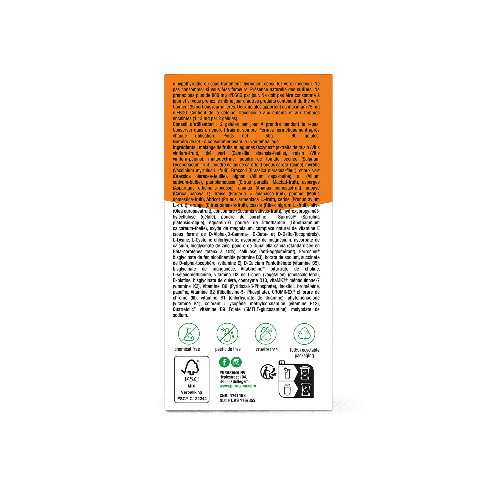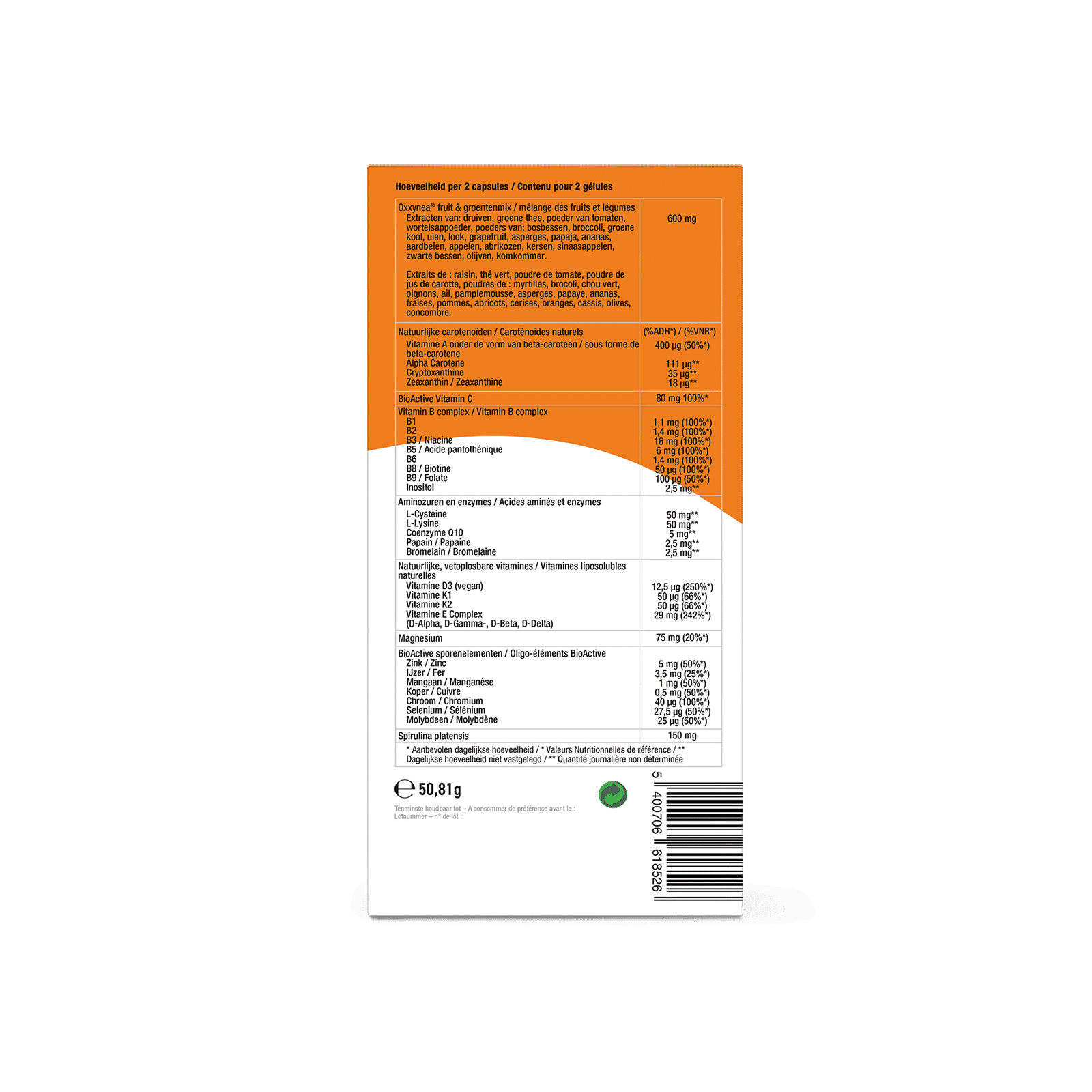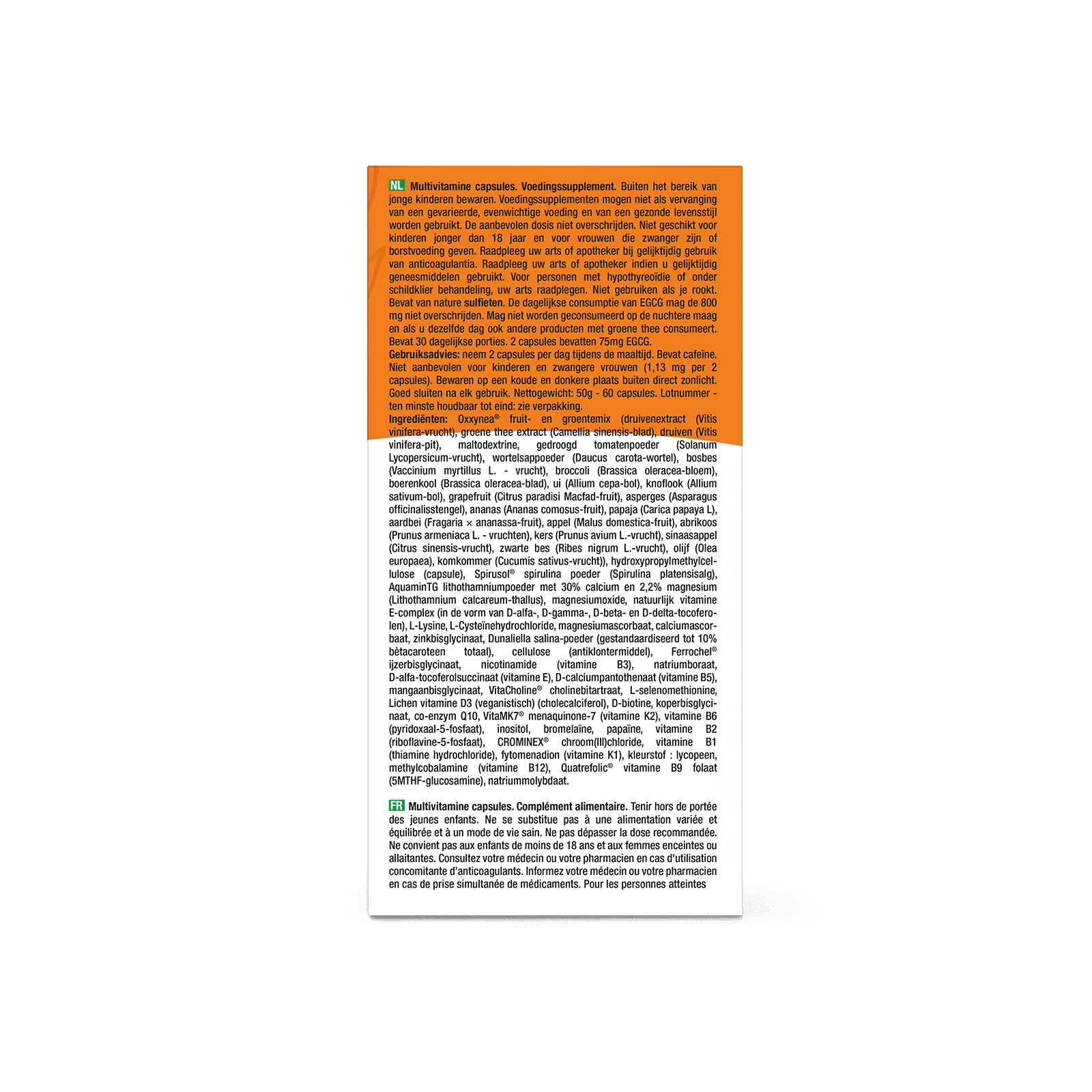 Oxxynea® fruit- en groentemix (druivenextract (Vitis vinifera-vrucht), groene thee extract (Camellia sinensis-blad), druiven (Vitis vinifera-pit), maltodextrine, gedroogd tomatenpoeder (Solanum Lycopersicum-vrucht), wortelsappoeder (Daucus carota-wortel), bosbes (Vaccinium myrtillus L. - vrucht), broccoli (Brassica oleracea-bloem), boerenkool (Brassica oleracea-blad), ui (Allium cepa-bol), knoflook (Allium sativum-bol), grapefruit (Citrus paradisi Macfad-fruit), asperges (Asparagus officinalisstengel), ananas (Ananas comosus-fruit), papaja (Carica papaya L), aardbei (Fragaria × ananassa-fruit), appel (Malus domestica-fruit), abrikoos (Prunus armeniaca L. - vruchten), kers (Prunus avium L.-vrucht), sinaasappel (Citrus sinensis-vrucht), zwarte bes (Ribes nigrum L.-vrucht), olijf (Olea europaea), komkommer (Cucumis sativus-vrucht)), hydroxypropylmethylcellulose (capsule), Spirusol® spirulina poeder (Spirulina platensisalg), AquaminTG lithothamniumpoeder met 30% calcium en 2,2% magnesium (Lithothamnium calcareum-thallus), magnesiumoxide, natuurlijk vitamine E-complex (in de vorm van D-alfa-, D-gamma-, D-beta- en D-delta-tocoferolen), L-Lysine, L-Cysteïnehydrochloride, magnesiumascorbaat, calciumascorbaat, zinkbisglycinaat, Dunaliella salina-poeder (gestandaardiseerd tot 10% bètacaroteen totaal), cellulose (antiklontermiddel), Ferrochel® ijzerbisglycinaat, nicotinamide (vitamine B3), natriumboraat, D-alfa-tocoferolsuccinaat (vitamine E), D-calciumpantothenaat (vitamine B5), mangaanbisglycinaat, VitaCholine® cholinebitartraat, L-selenomethionine, Lichen vitamine D3 (veganistisch) (cholecalciferol), D-biotine, koperbisglycinaat, co-enzym Q10, VitaMK7® menaquinone-7 (vitamine K2), vitamine B6 (pyridoxaal-5-fosfaat), inositol, bromelaïne, papaïne, vitamine B2 (riboflavine-5-fosfaat), CROMINEX® chroom(III)chloride, vitamine B1 (thiamine hydrochloride), fytomenadion (vitamine K1), kleurstof : lycopeen, natriummolybdaat, methylcobalamine (vitamine B12), Quatrefolic® vitamine B9 folaat (5MTHF-glucosamine).