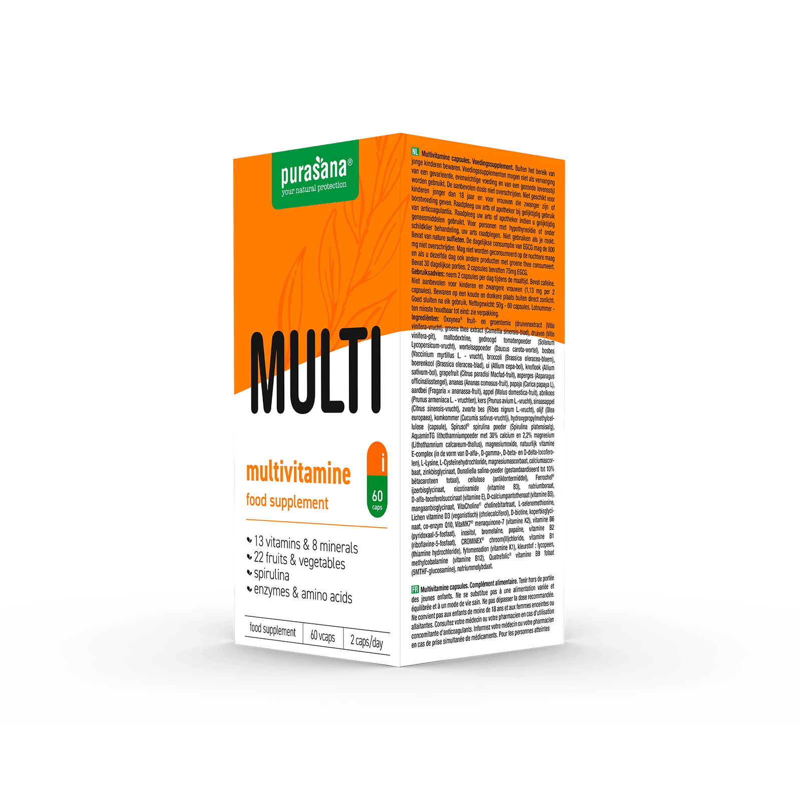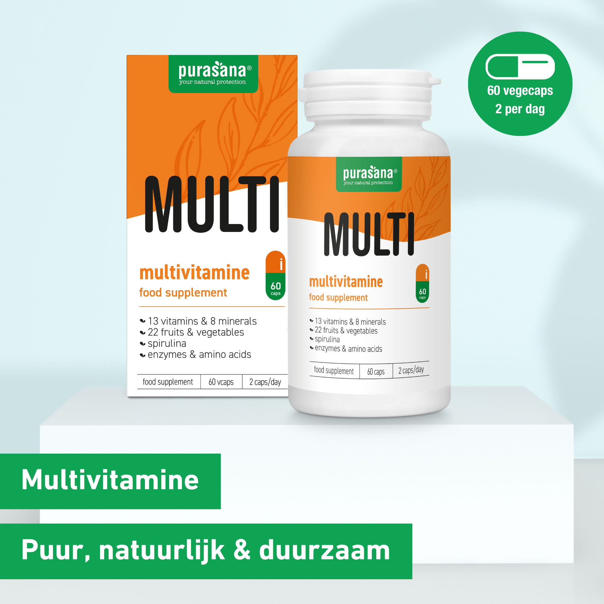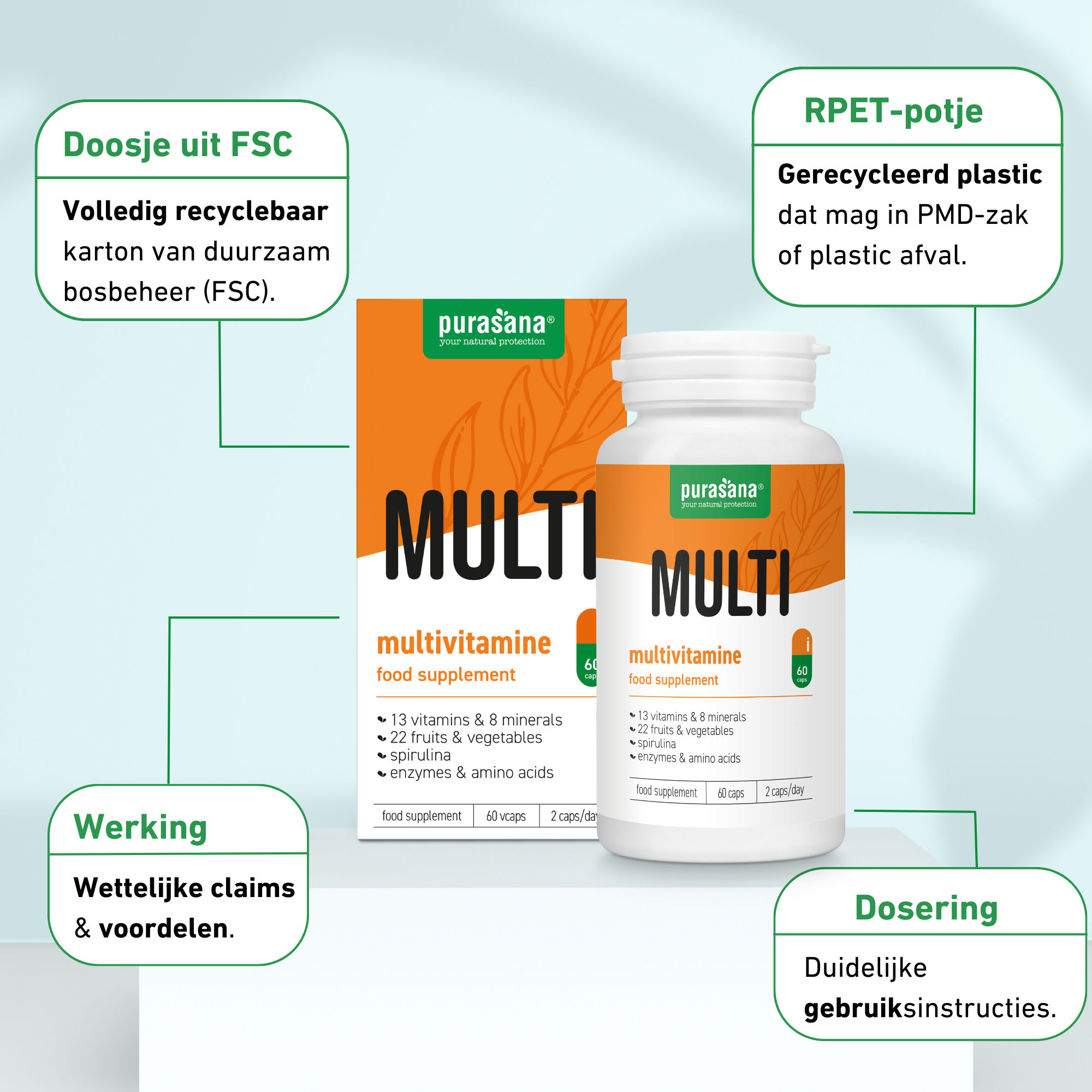 De multivitamine is goed voor jou en voor het milieu. Enerzijds zijn de multivitamine capsules vrij van synthetische stoffen, pesticiden en de allergenen lactose, ei, melk, suiker en gluten. De capsule zelf bestaat uit cellulose (HPMC), beschermt de ingrediënten tegen hitte en vocht, en garandeert een optimaal en gelijkmatig vrijkomen van de inhoud. Anderzijds is de verpakking waarin de multivitamine komt 100% recyclebaar dankzij een rPET-potje en FSC-gecertificeerd karton.