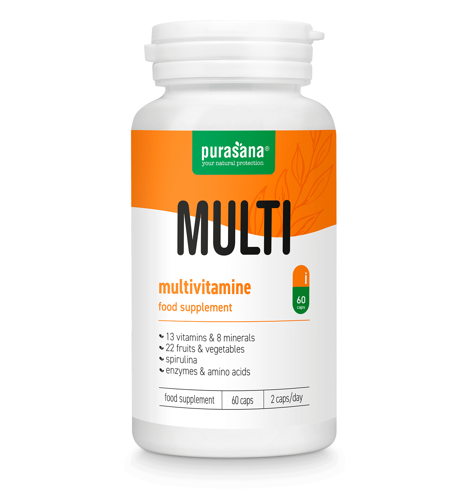 Dagelijkse multivitamine voor volwassenen met 13 vitamines en 8 mineralen in optimale dosering, verrijkt met 22 fruit- en groentepoeders, spirulina, aminozuren en enzymen.