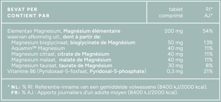 Microkrystallijne cellulose (vulmiddel), Magnesium bisglycinaat, Magnesium tauraat, Magnesium malaat, Magnesium citraat, Aquamin® TG Magnesium, vegetarisch magnesiumstearaat (anti-klontermiddel), isomalt (bindmiddel), silica (anti-klontermiddel), tapioca dextrine (bindmiddel), coating (HPC, HPMC), Pyridoxaal 5 fosfaat (Vitamine B6).