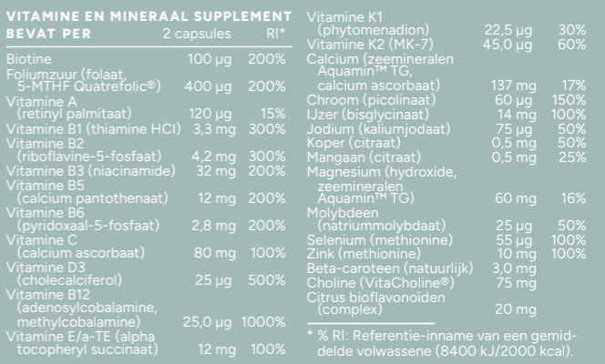 Mineralen, VitaCholine®, Vitaminen, HPMC vegetarische capsule (huls), vulstof (rijstbloem), Natuurlijk bèta-caroteen, anti-klontermiddel (Nu-Flow).